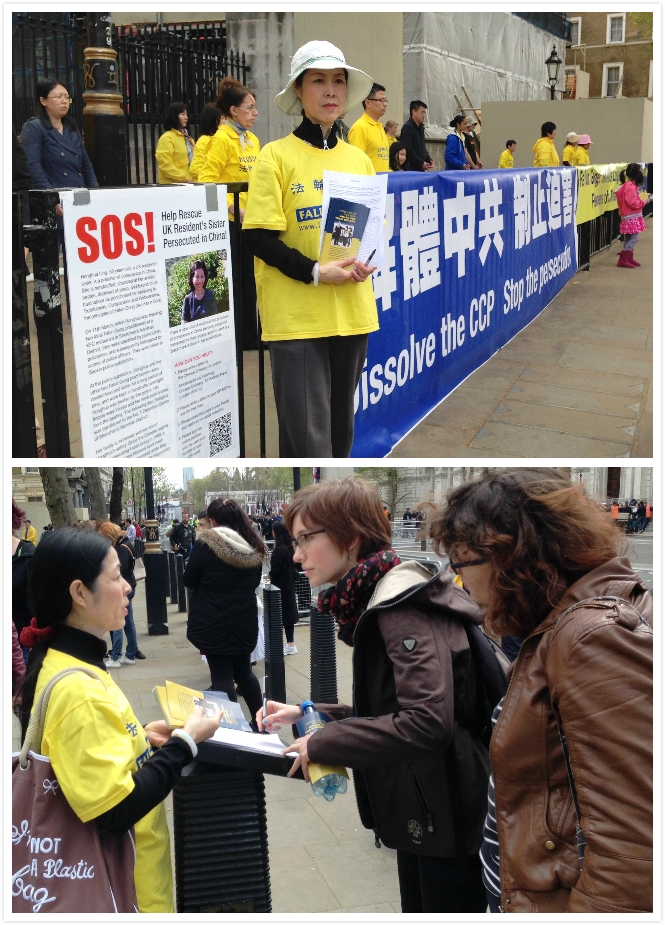 ![]() 图2:英国法轮功学员陈蕾站在印有姐姐照片的紧急营救信息展板前,很多路人毫不犹豫的在呼吁关注和紧急营救的征签表上签名 |