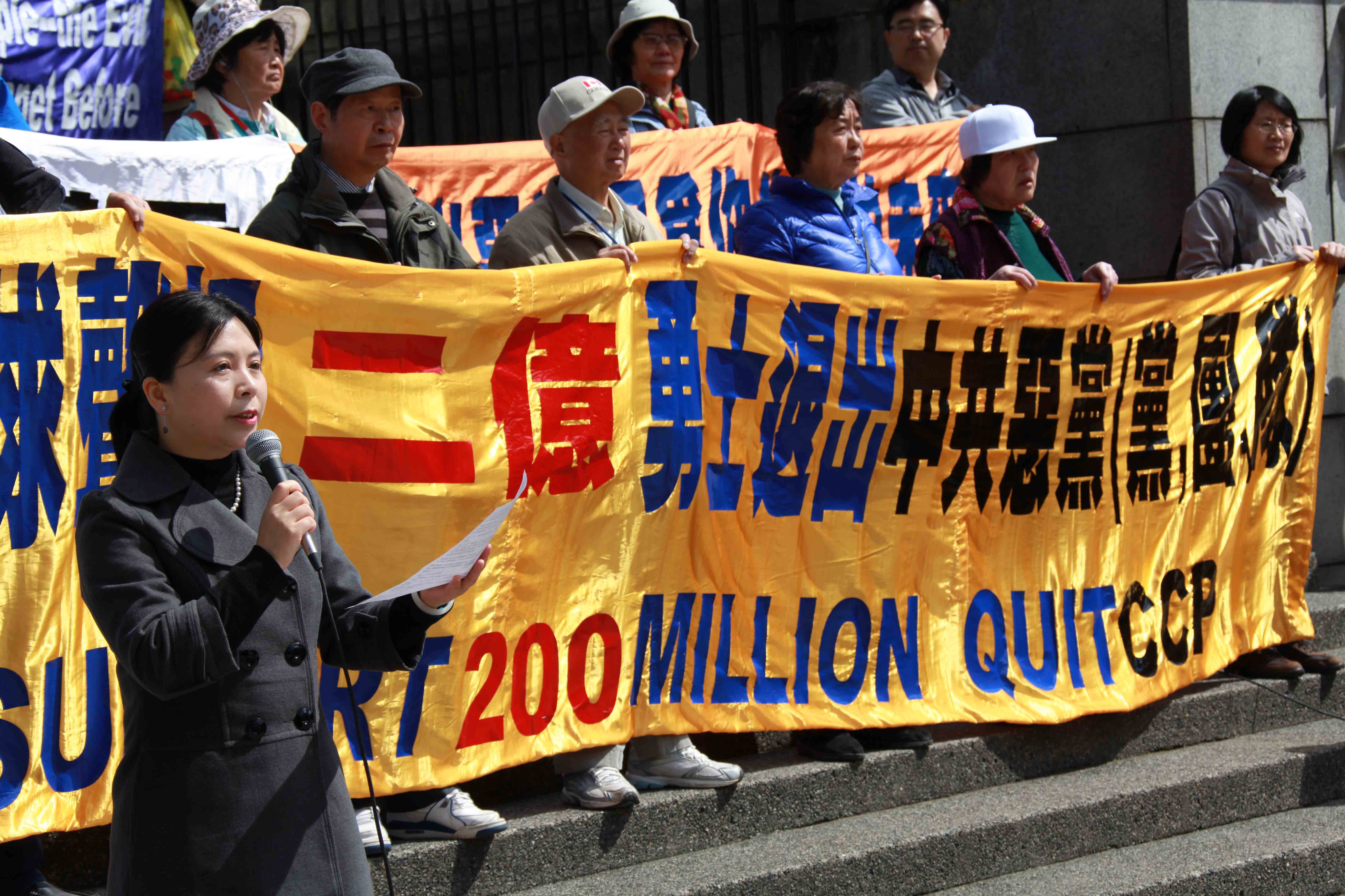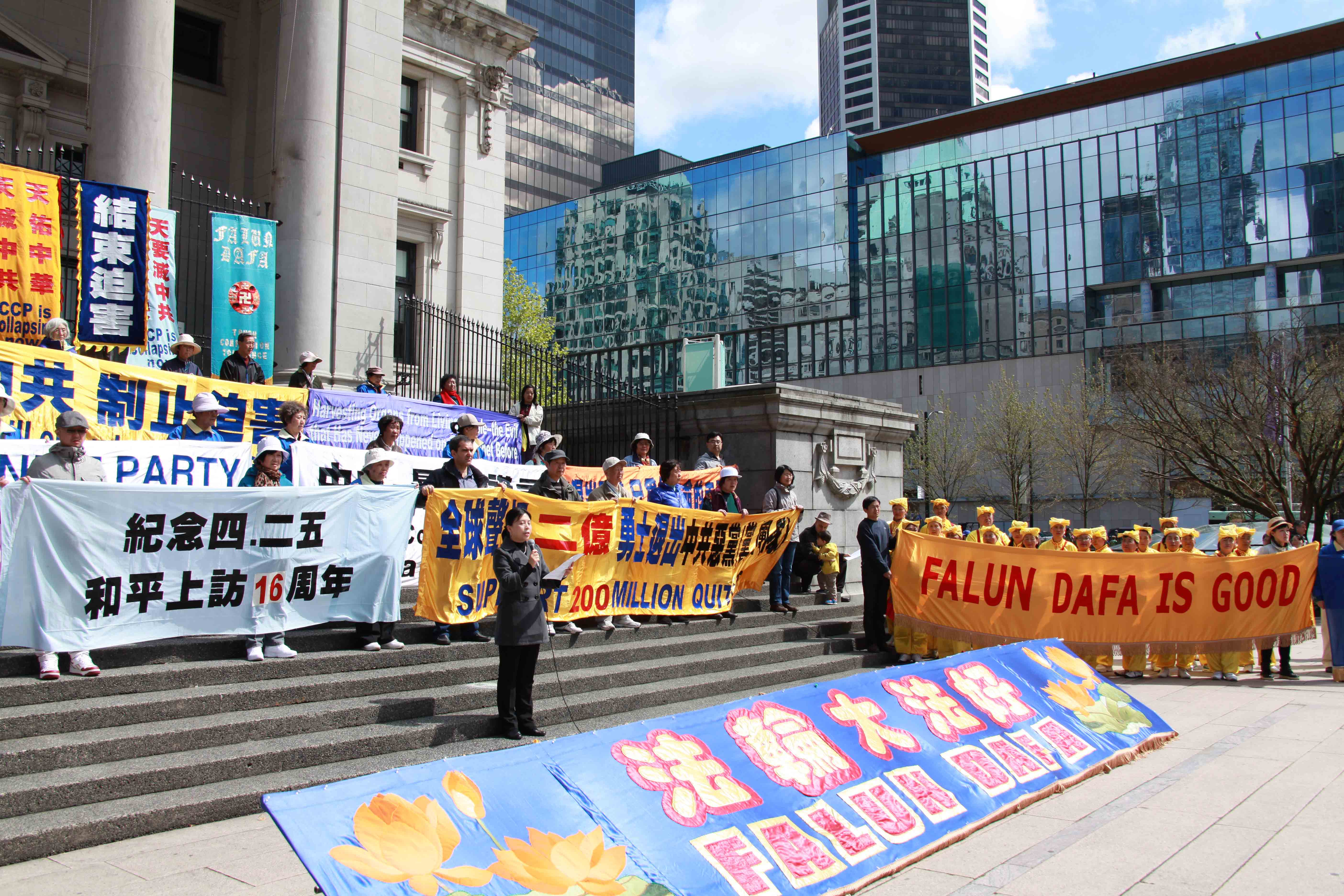 温哥华退党服务中心方女士表示,今天我们聚集在这里纪念两个意义非凡的里程碑事件,一个是“四•二五”北京万人和平上访,另一个是在一周前刚刚发生的两亿中国人“三退”声明退出中共相关组织的事件。“四•二五”和“三退”这两个事件,看似互不相干,其实密切相关。“四•二五”是为法轮功维护炼功的权利,其实也是对中共这个作恶多端的组织的挽救,劝其悬崖勒马,不要对佛法犯罪。“三退”是启悟民心分清正邪,其实也是对中共党徒和成员的挽救,不要其做中共的陪葬品。