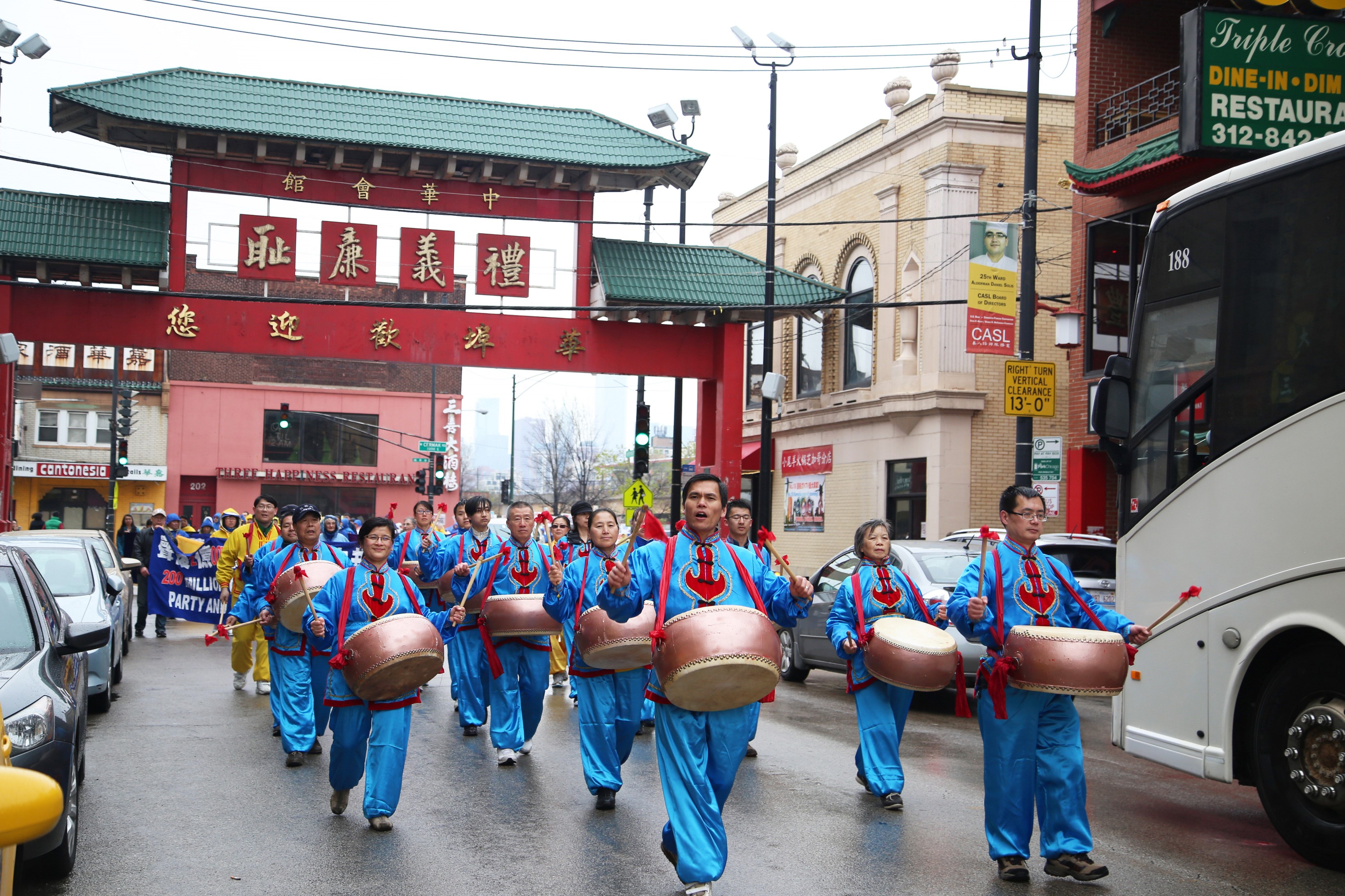 法轮功学员的队伍沿永活街出发,途经舍麦街(Cermak)和亚珠街(Archer)这两条主要的中国城街道,然后回到永活街。游行队伍开头是身着蓝色炼功服的唐鼓队,他们伴着音乐敲出雄壮的鼓点;随后是法轮功学员手持“声援2亿70万勇士退出中共党团队”、“爱国不等于爱党 中共不等于中国”、“快读《九评共产党》 退党自救保平安”等横幅,伴随着《退党进行曲》,呼唤人们认清中共的邪教本质,脱离它获得新生。
