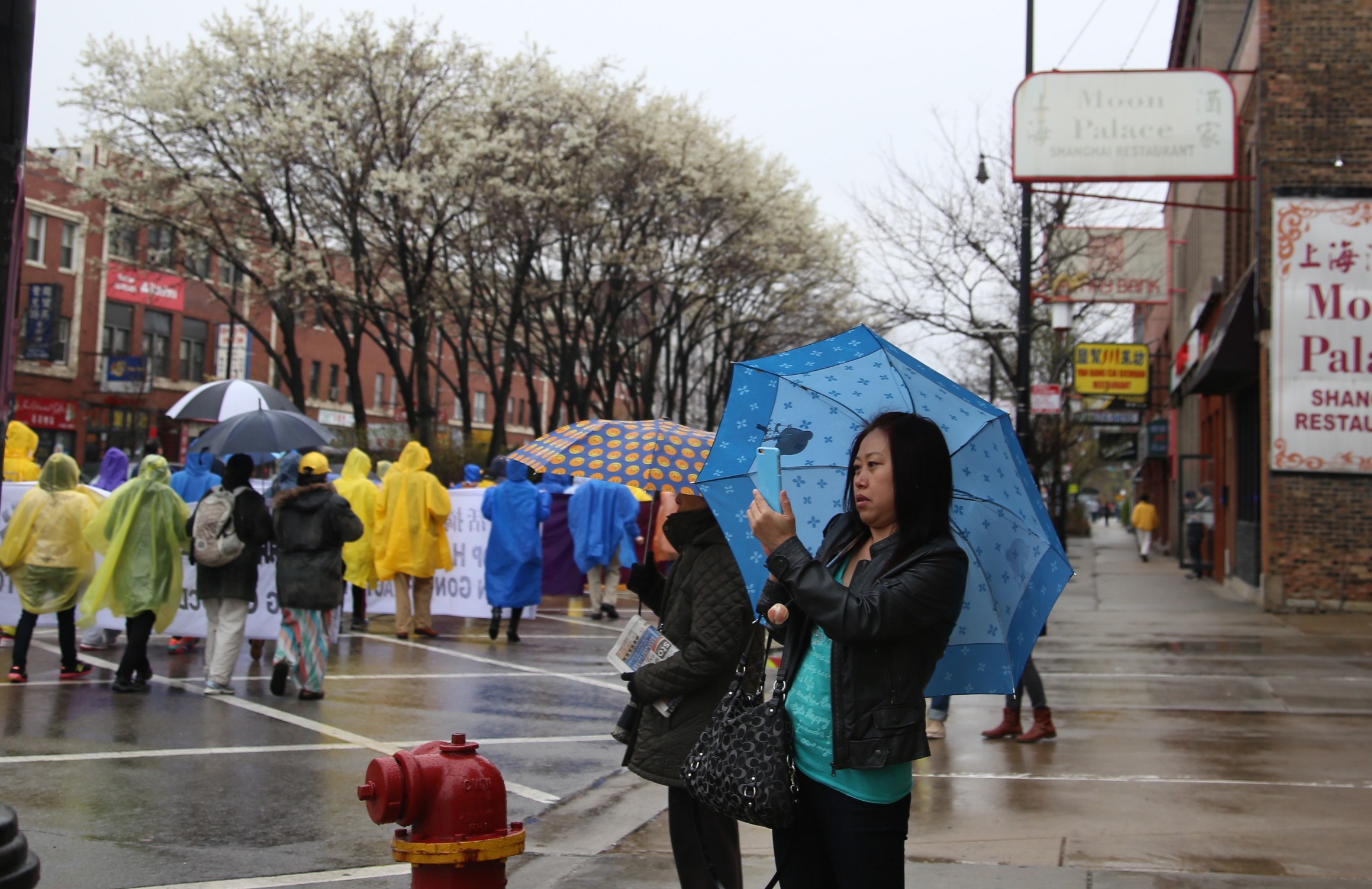 当天芝加哥预报全天下雨,在游行开始之际雨渐渐的停了。负责监护游行的警察看到学员平和的炼功发正念,看到雨渐小,乌云渐开,高兴的说“希望每天都做这样的事。”