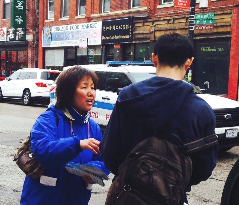 退党服务中心的义工姜女士见证了发生在芝加哥中国城真相点的变化,二零零九年的时候,她开始了在芝加哥中国城讲真相劝三退,那时中国城的人,很多都听信中共邪党的造谣宣传,对法轮功学员冷眼相看,甚至当面撕资料,骂法轮功学员不爱国、叛徒等。