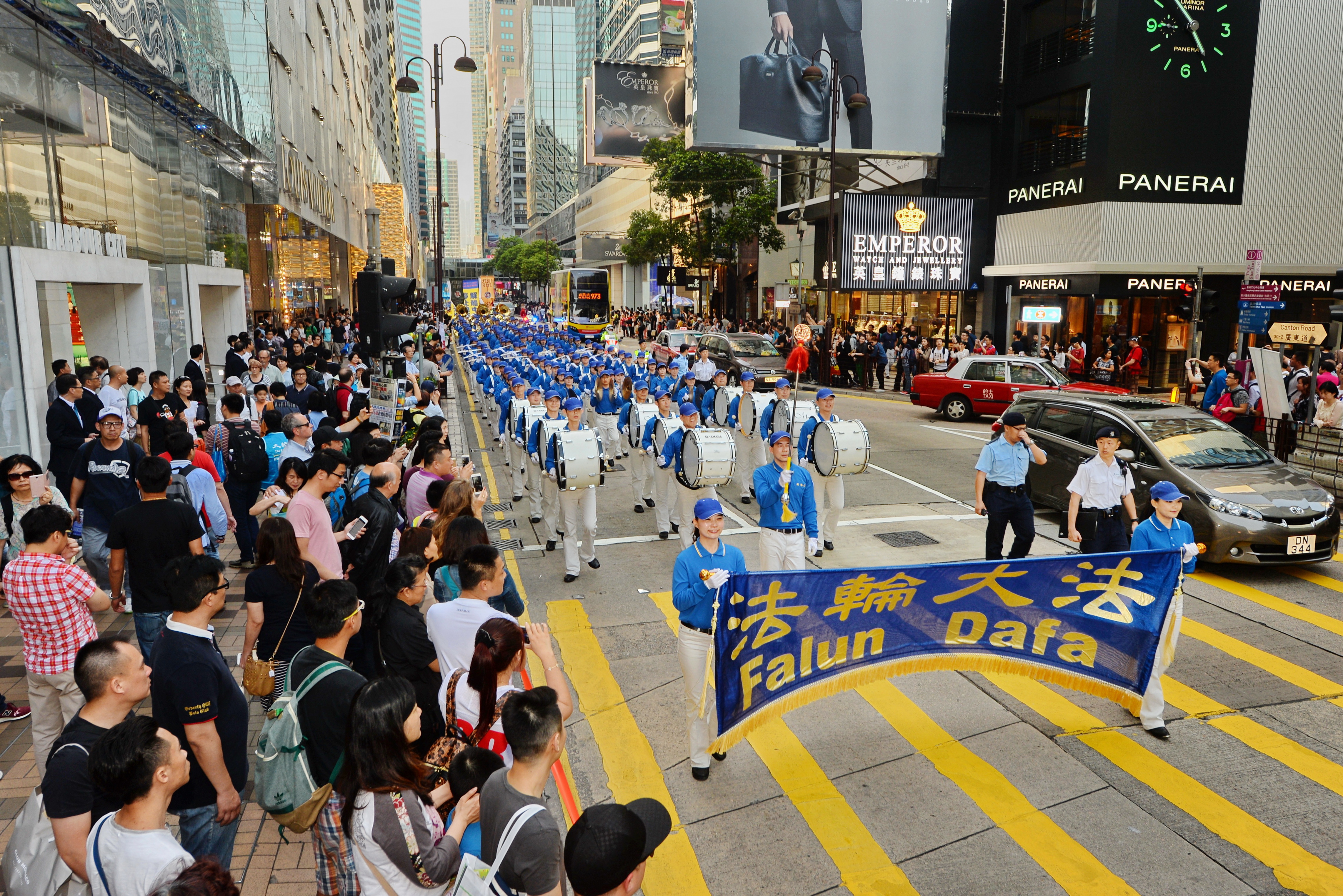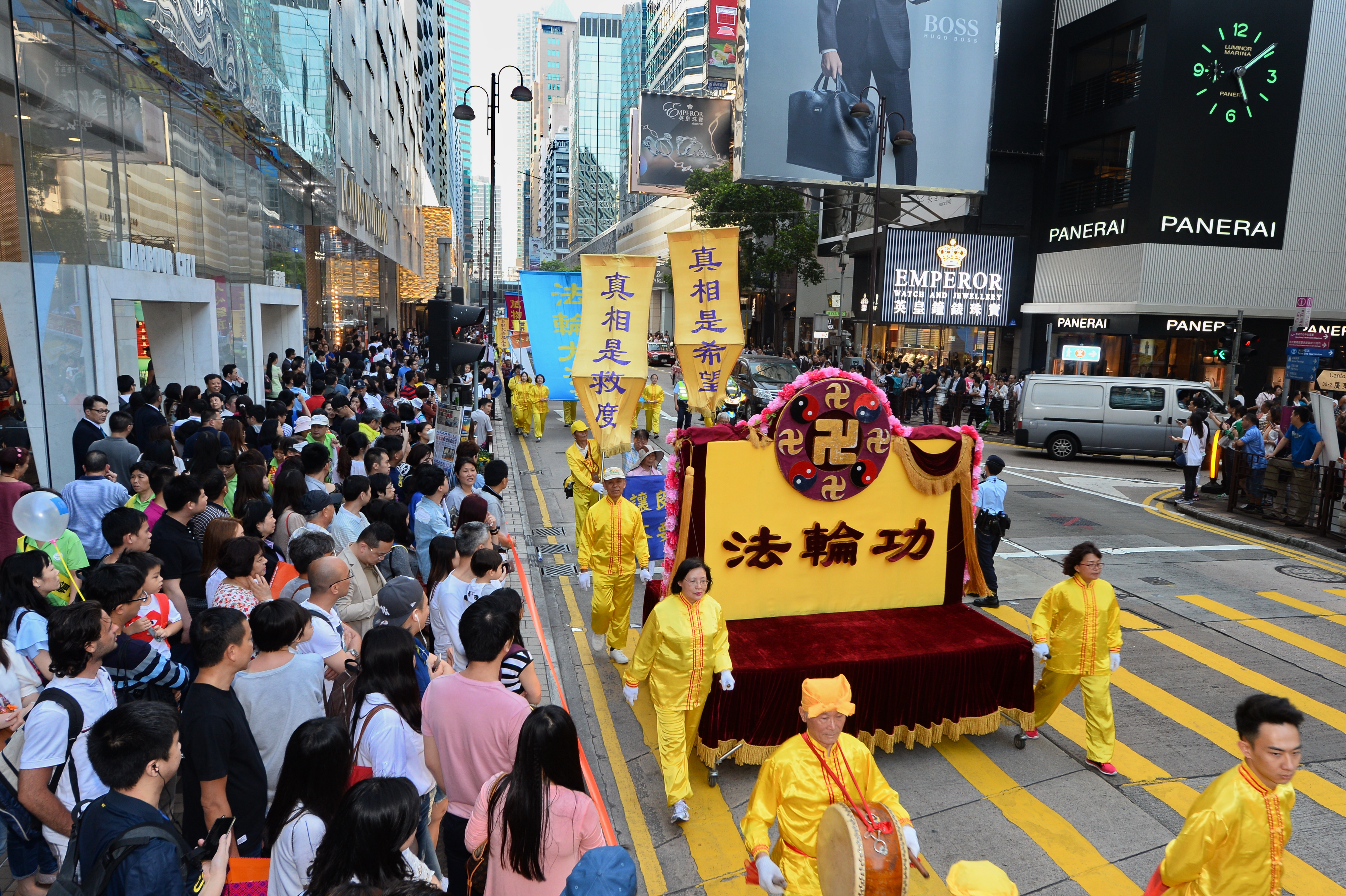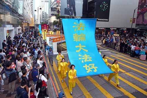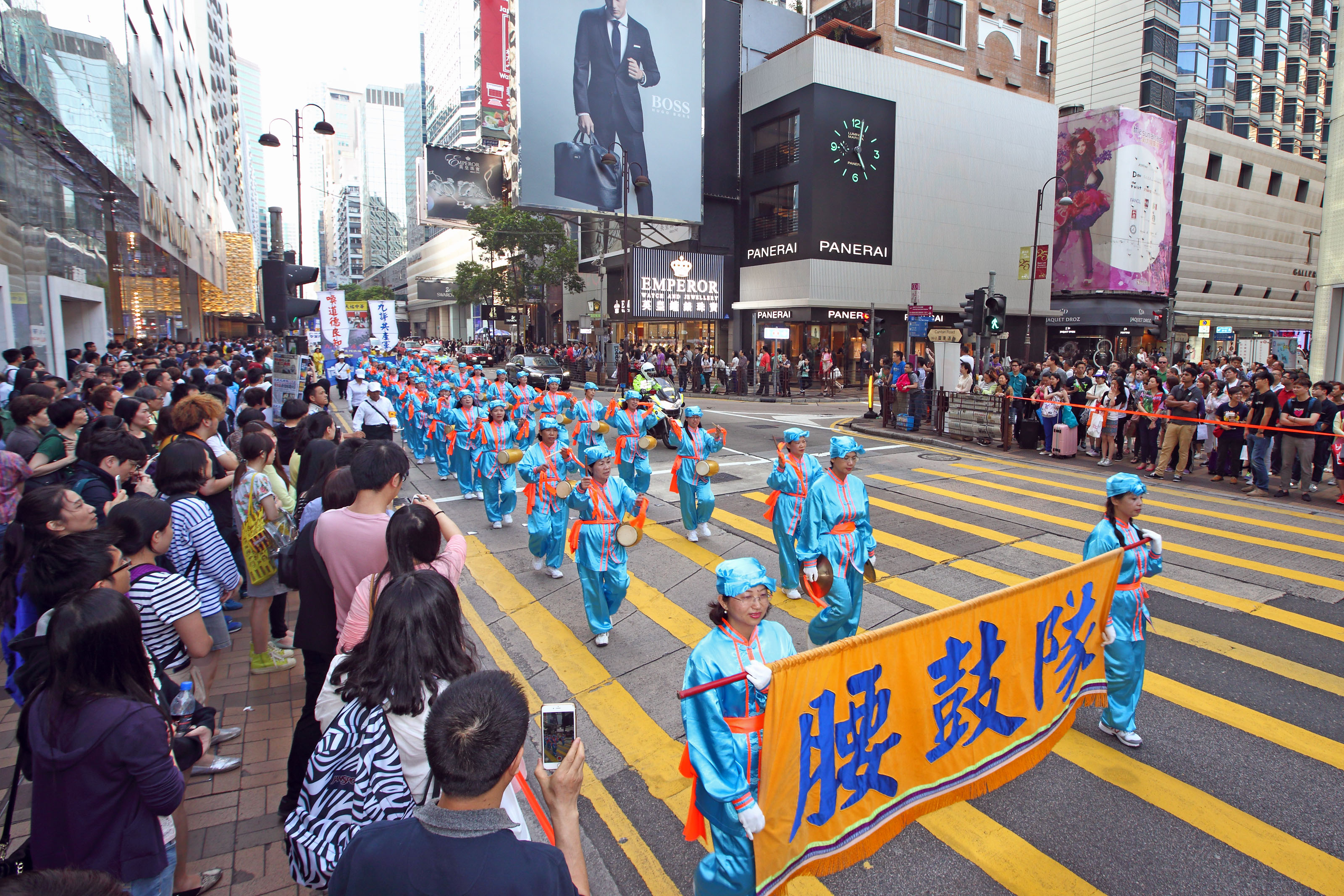 天国乐团响亮的演奏声、腰鼓队、旗鼓队及各式大小的幡旗横幅,声势浩大的游行阵容,吸引街道两旁的市民及大陆游客观看,许多人拿起相机、手机或iPad拍照。不少大陆游客表示是第一次看到法轮功(学员)游行,感到非常震撼,有的表示要把游行画面带回去与亲友分享。