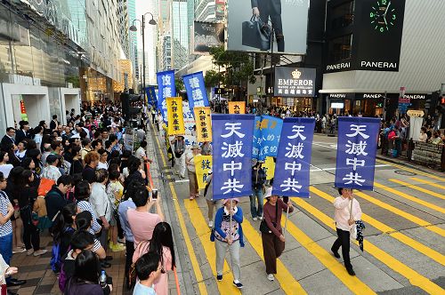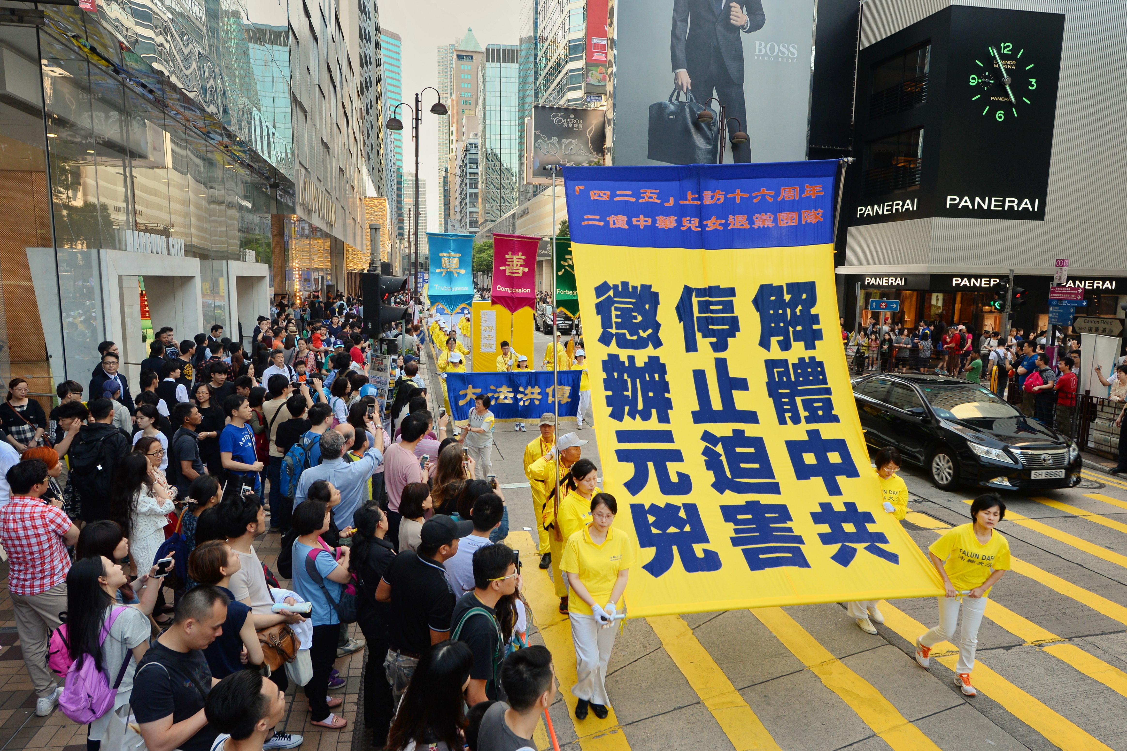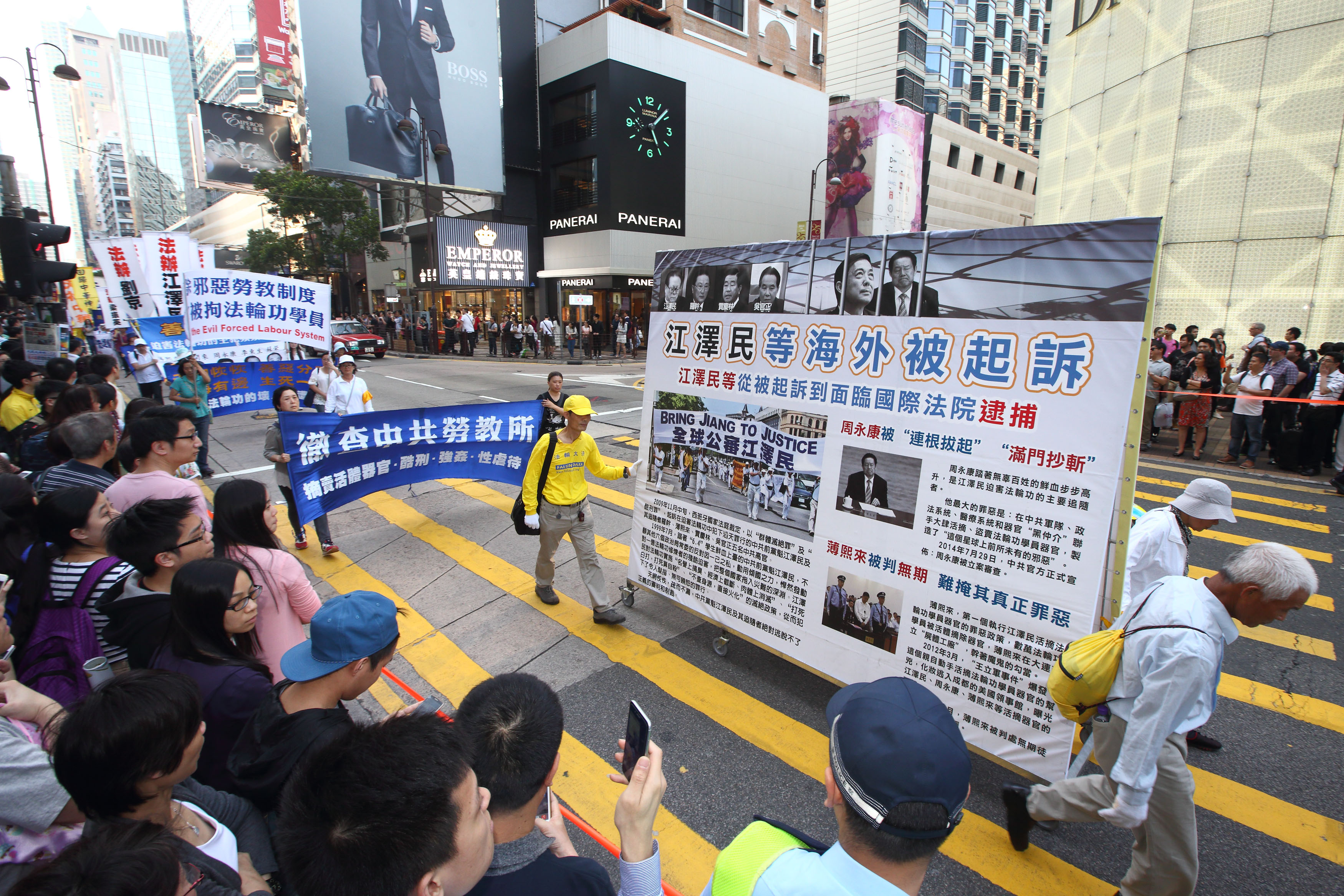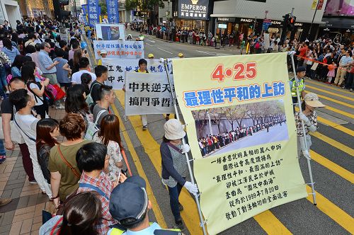 天国乐团响亮的演奏声、腰鼓队、旗鼓队及各式大小的幡旗横幅,声势浩大的游行阵容,吸引街道两旁的市民及大陆游客观看,许多人拿起相机、手机或iPad拍照。不少大陆游客表示是第一次看到法轮功(学员)游行,感到非常震撼,有的表示要把游行画面带回去与亲友分享。