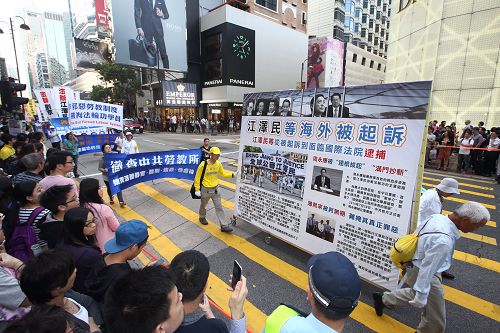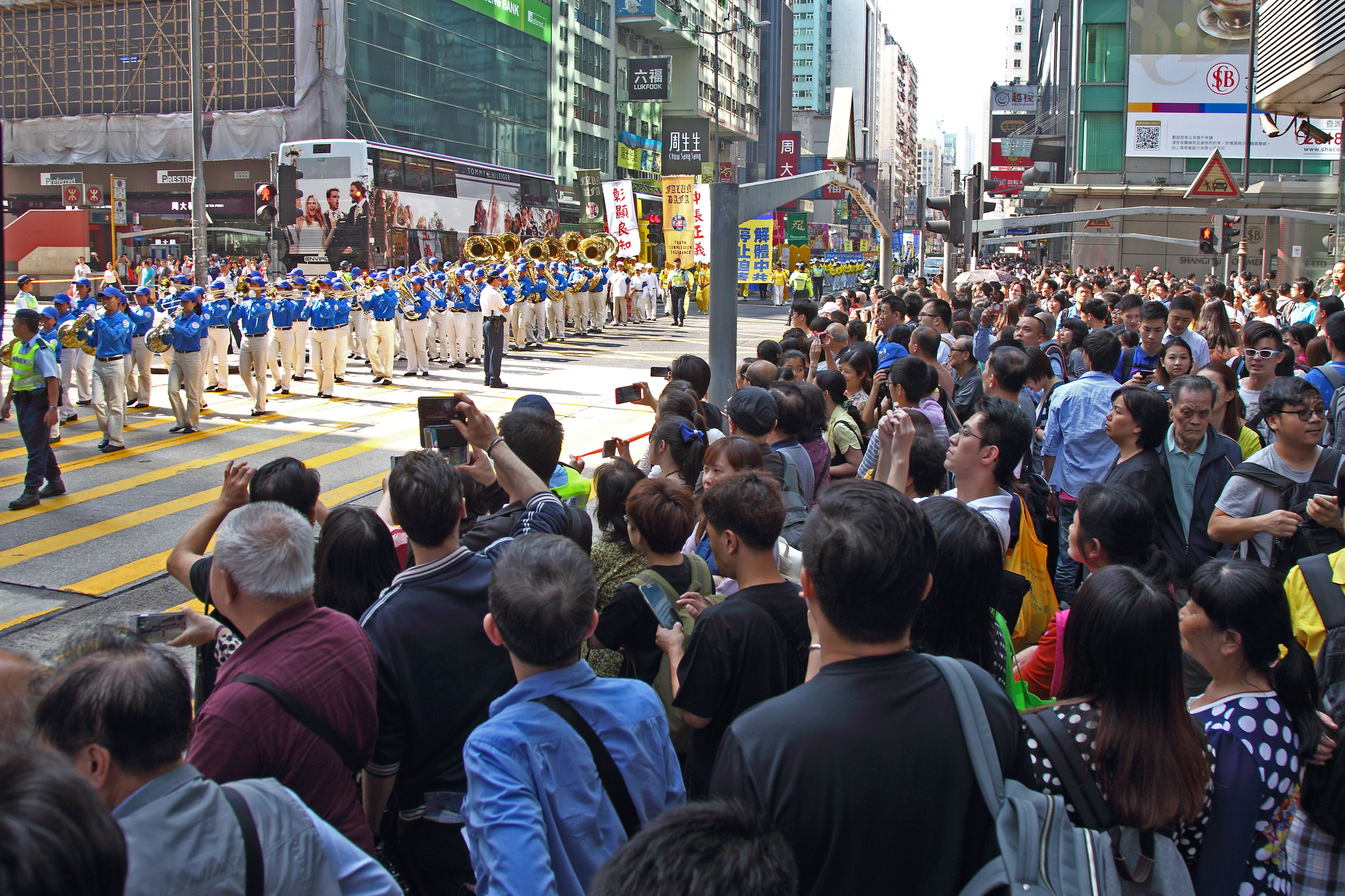 ![]() 法轮功学员的游行队伍在天国乐团的引领下,浩浩荡荡走过九龙区闹市,沿途吸引民众聚焦并拍照。 |
