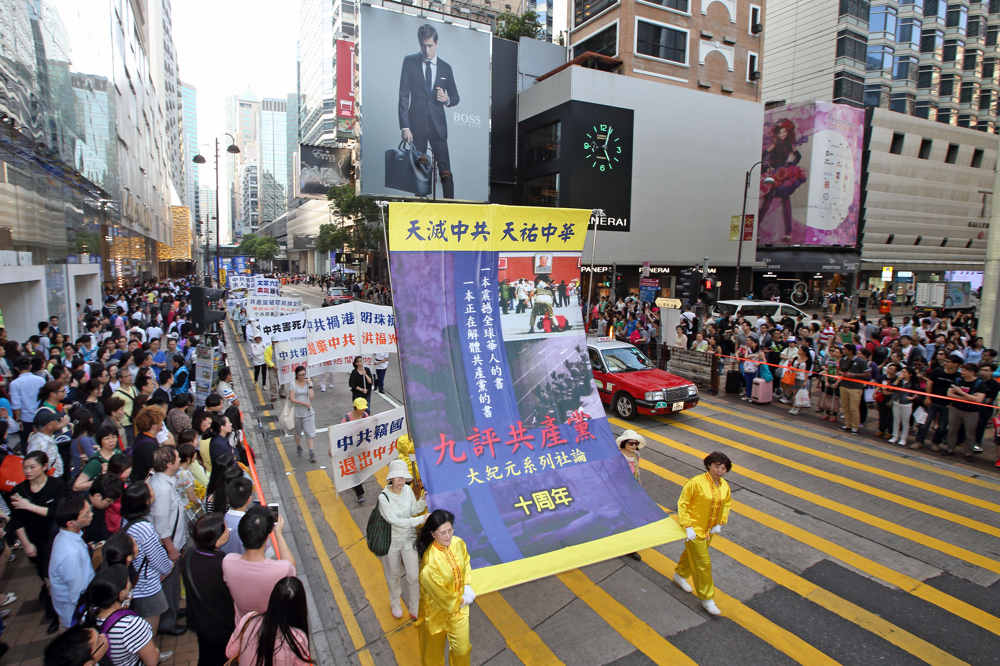 下午二点,约八百名法轮功学员组成的游行队伍,在天国乐团引领下,从长沙湾游乐场出发,沿着九龙区的闹市游行至终点尖沙咀码头,历时约三个小时。