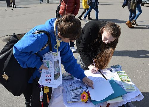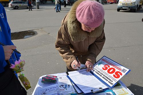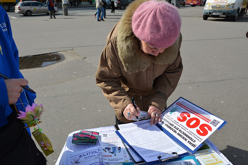 很多人对于因信仰遭到迫害反应强烈。一对夫妇详细阅读了展板内容并与学员们交谈之后毫不犹豫的签下自己的名字。他们表示,共产党一贯破坏人的道德、信仰。他们说,法轮功让人向善,让人身心健康,他们绝不相信法轮功修炼者会是坏人。他们说自己曾经因为儿子的离世悲痛不已,听到如此美好的法轮功音乐让他们感到平静。他们感谢法轮功学员关心在中国遭到迫害的人,并向俄罗斯人传递真相。