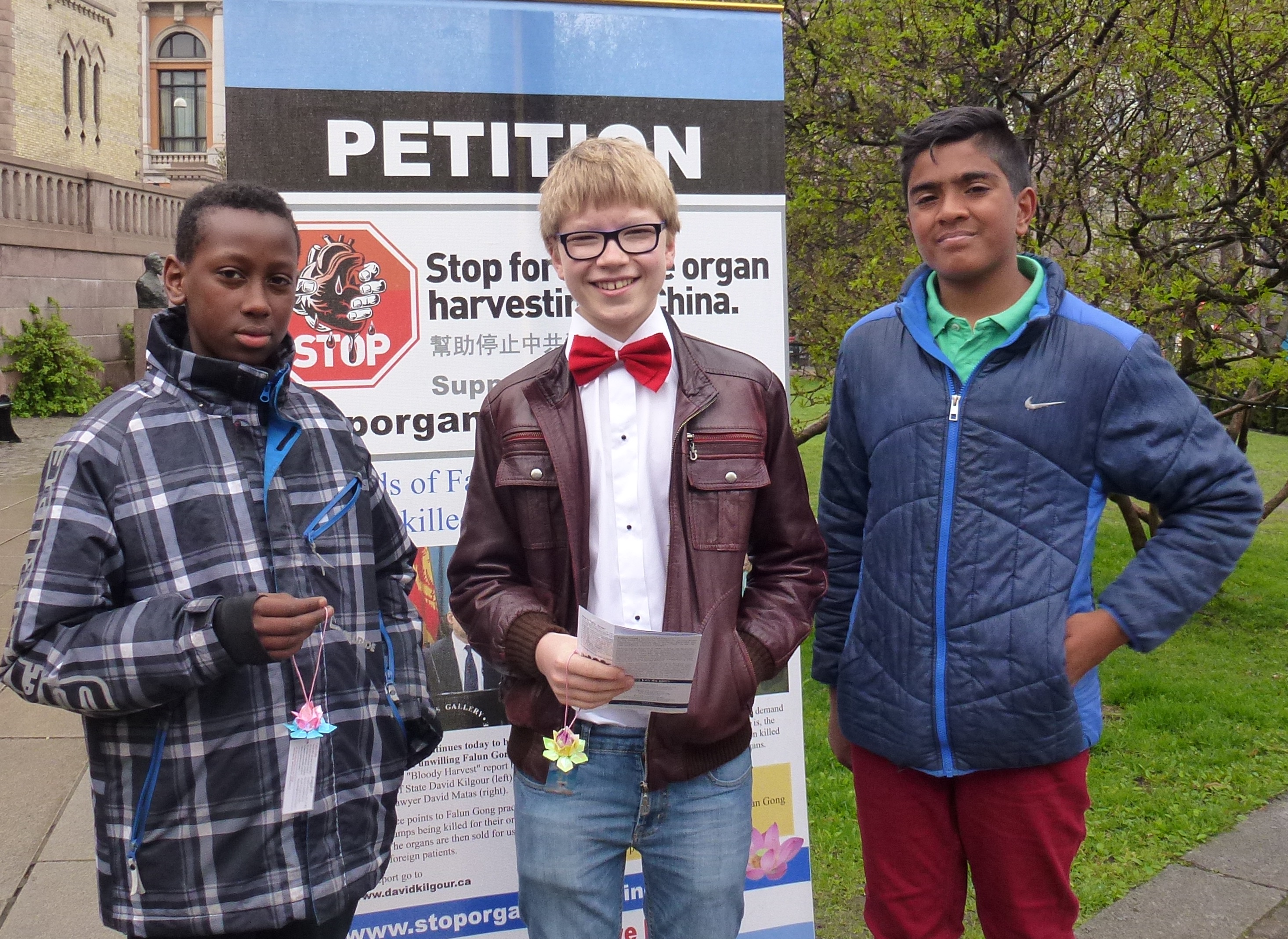 翰德里克(Hendrick)和他的两个同伴玛泰欧(Matteo)和塔如桑(Tharusan)是挪威一所学校的中学生,他们经过法轮功学员的活动地点时停下了脚步。
