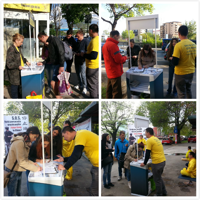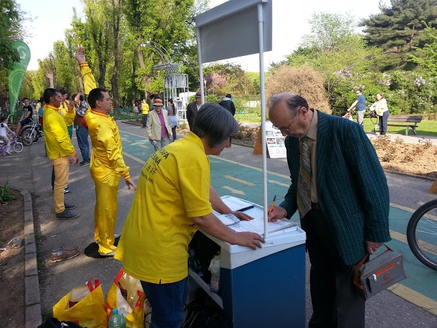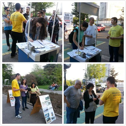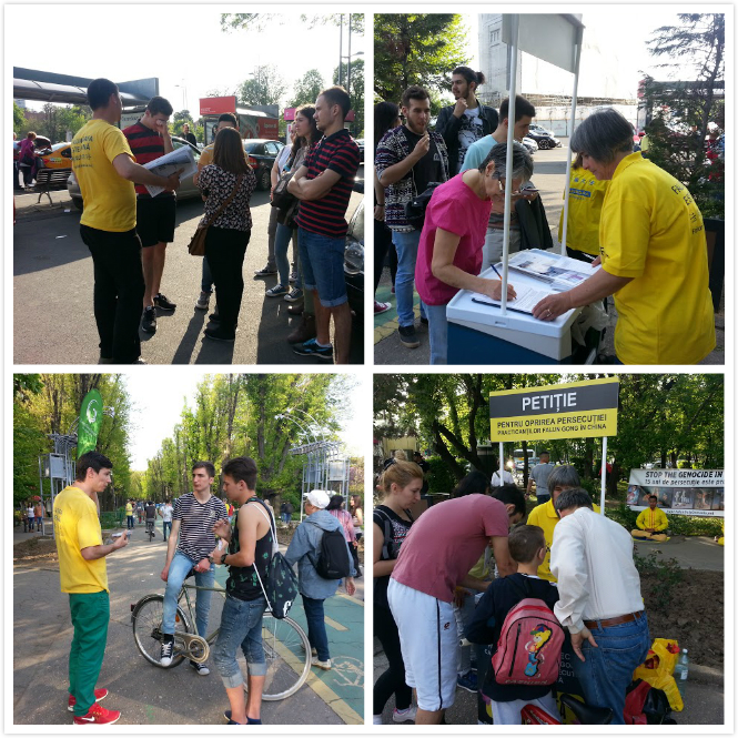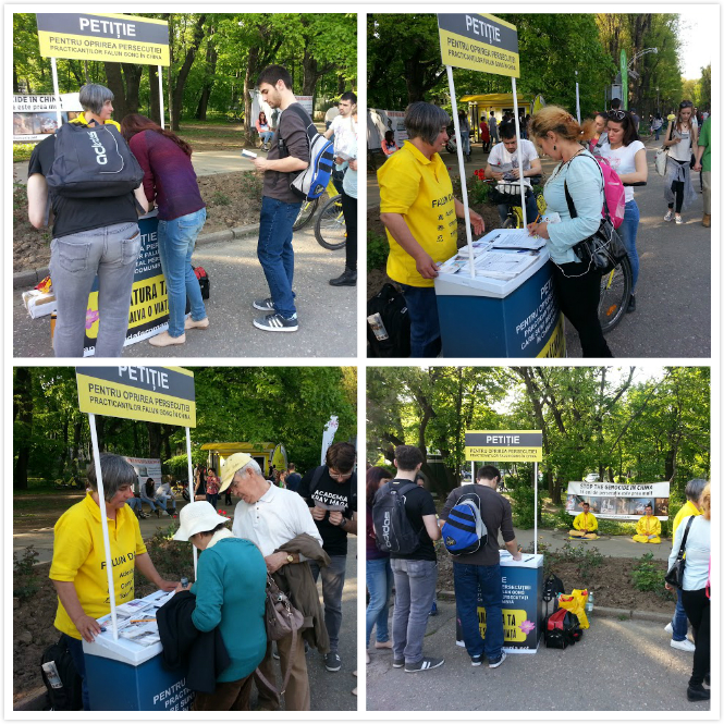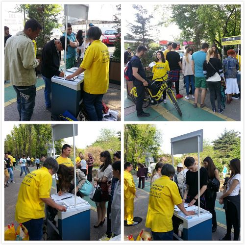 抗议活动结束后,当天下午学员们来到了中使馆旁边的Herăstrău公园进行了讲真相征签活动。学员们向在公园游玩休闲的人们发放真相资料并向他们讲述发生在中国大陆的迫害真相。人们听到真相后纷纷来到签名台前在DAFOH请愿书上签名支持法轮功学员反迫害。