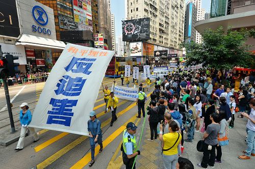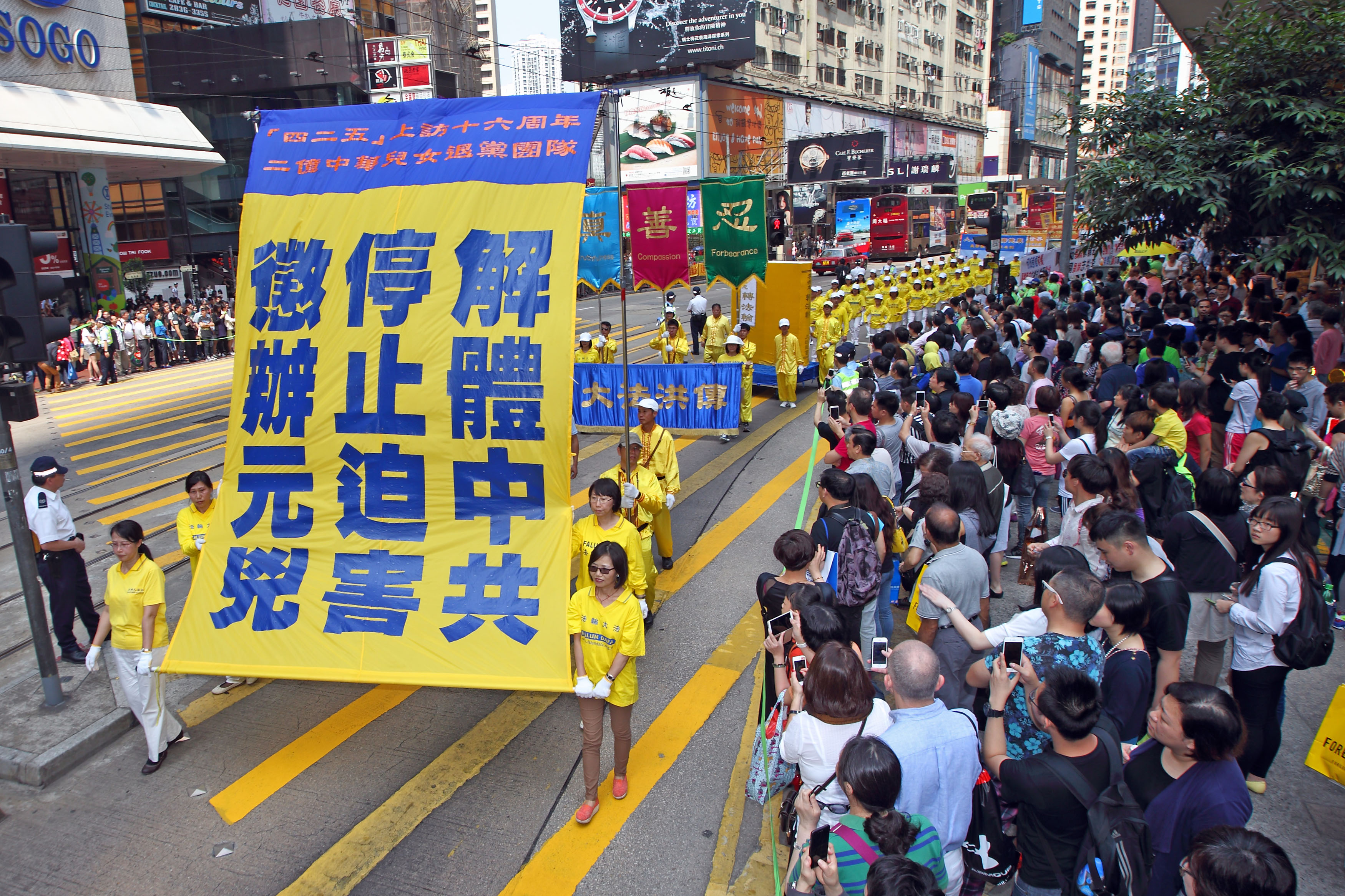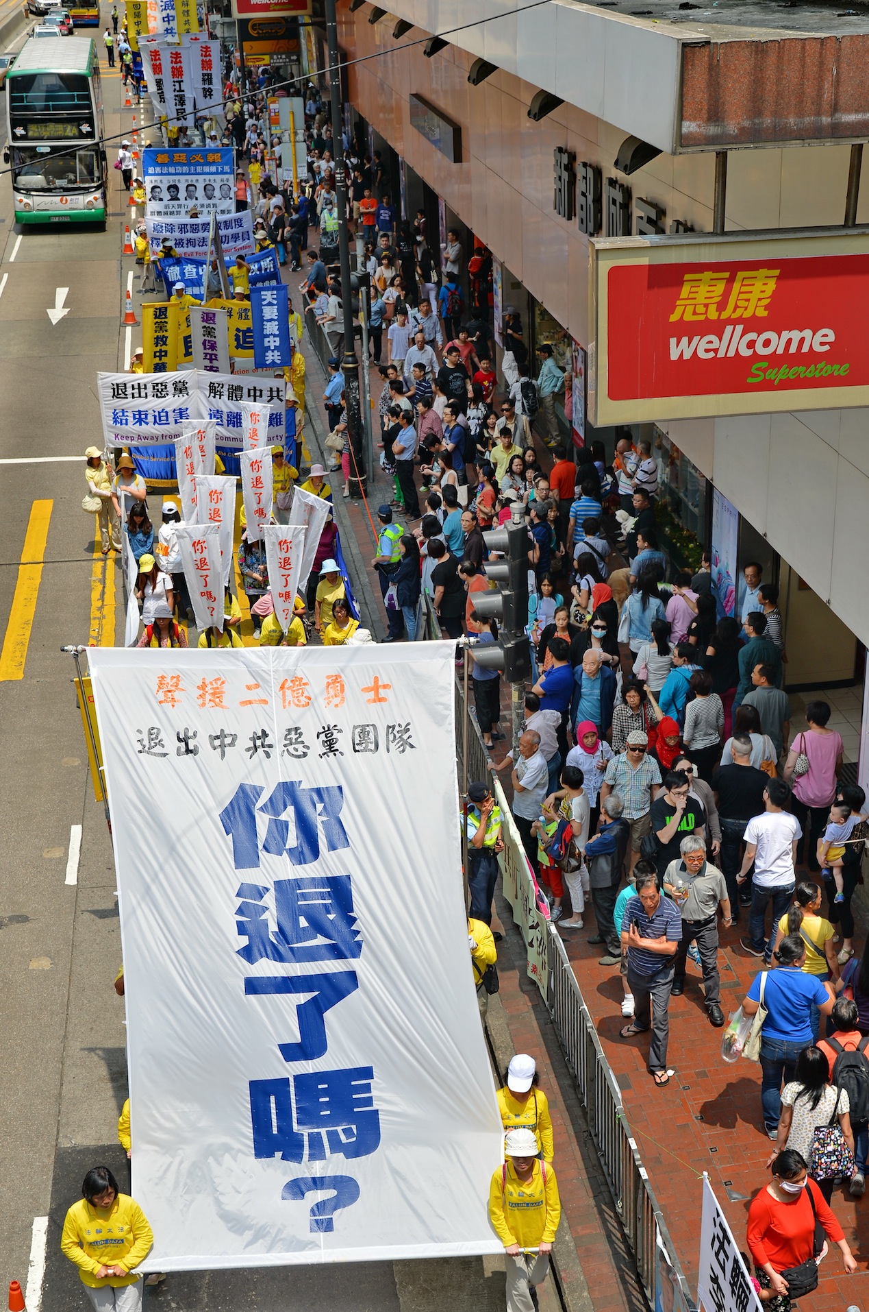 四月二十六日,约八百名法轮功学员从北角英皇道游乐场出发,游行至中环爱丁堡广场,最后在中环爱丁堡集合大炼功,场面平静祥和。当“大法洪传”、“真善忍”、“你退了吗?”、“天要灭中共退党保平安”等幡旗横幅,在香港岛闹市中心呈现,吸引很多大陆游客观看,不少人都感觉震撼。