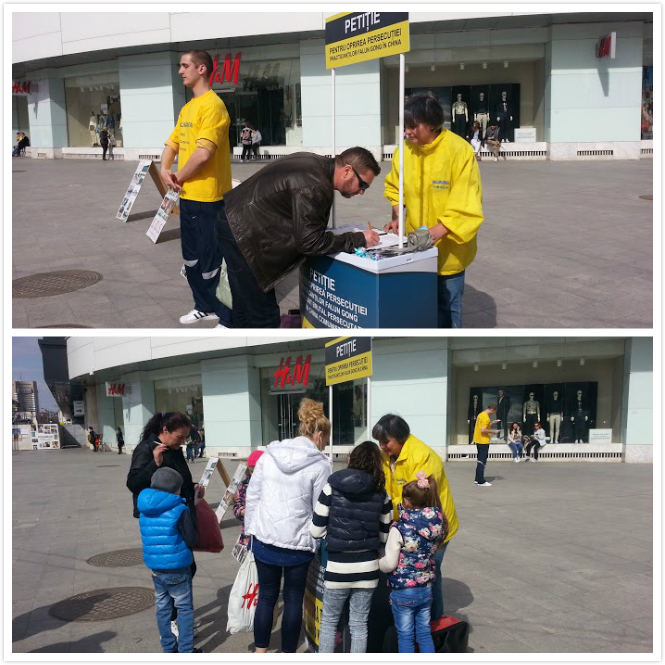 法轮功学员们有的在为行人展示功法,有的在给行人发放真相日历和资料,还有的在为正驻足观看酷刑展板的路人们讲解图片内容。很多行人看到横幅后驻足阅读,并主动到签名台前在“反对强制摘取器官的DAFOH请愿书”上签名支持法轮功。一百五十多名罗马尼亚人在DAFOH请愿书签了名。