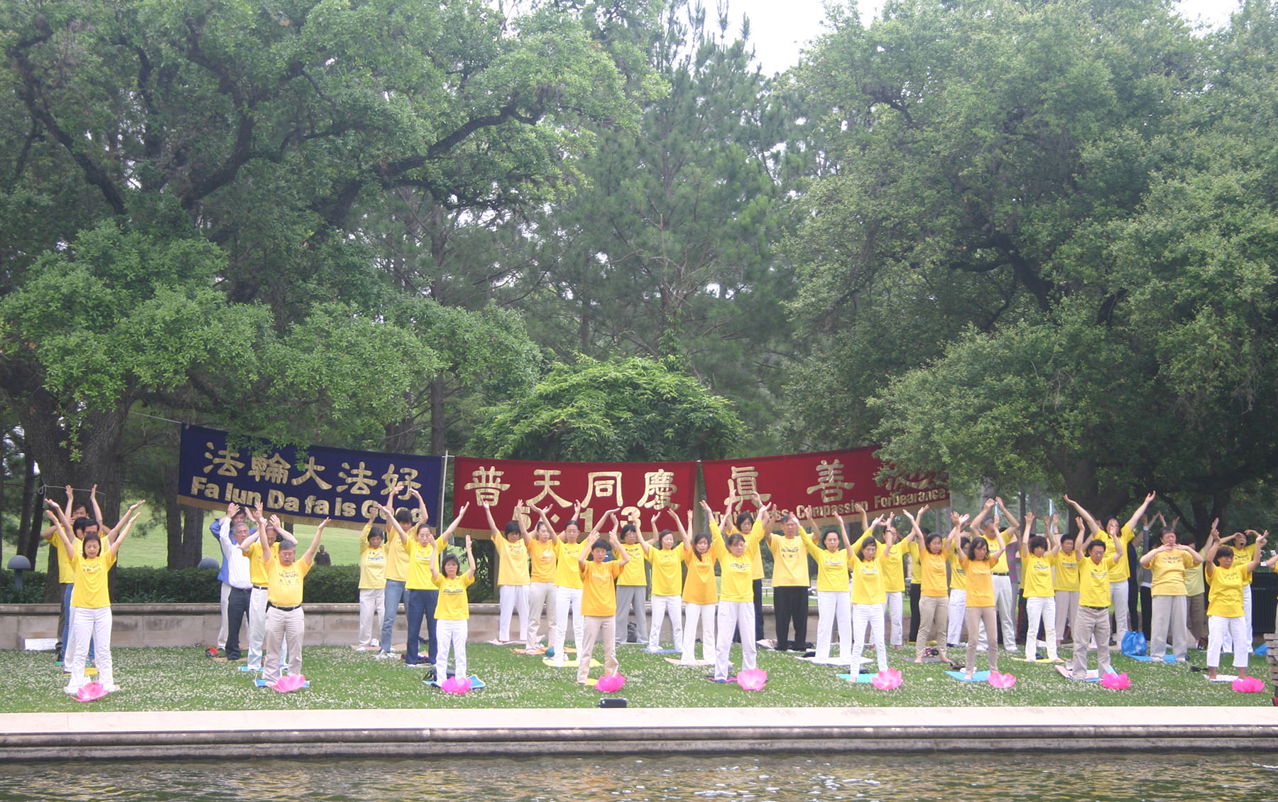 ![]() 休士顿法轮功学员在市中心著名荷门公园(HermannPark)炼功,庆祝法轮大法洪传二十三周年 |