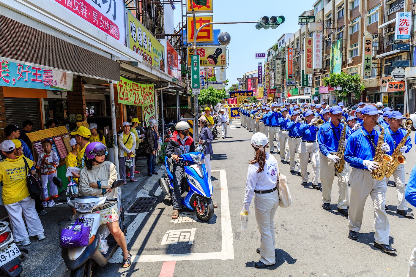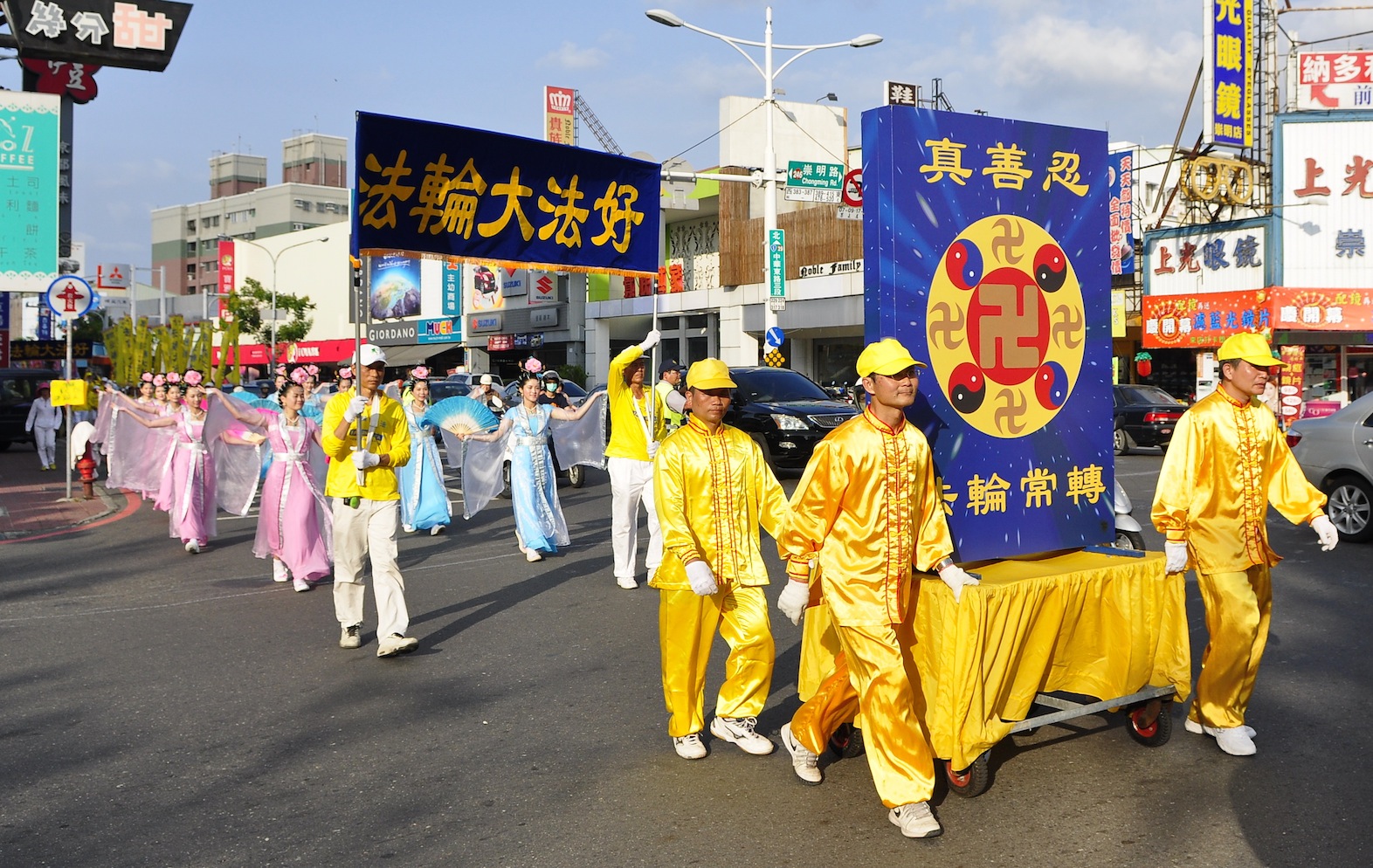 ![]() 台南部分法轮功学员遊行庆祝世界法轮大法日,庆祝活动由阵容庞大的天国乐团前导,吸引了很多民众夹道欢迎。 |