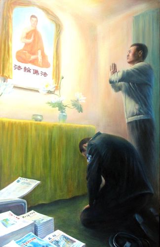 这是发生在本地区的一个真实的事情,一天区市610头子伙同当地610头子,公安分局局长及派出所警察等30多人,黑云压顶般扑向当地法轮功真相资料点——即大法弟子老郑(化名)家,企图抄家绑架,老郑正念抵制,并向他们讲述法轮大法的真相,劝告他们放下罪恶选择光明。数小时后,610头子央求老郑,说只进屋看一看,老郑允许610头子一人进入,其他人不许动。进屋后面对大法师尊法像,老郑正告610头子:“这是我们的师父,你现在赎罪还来得及。”610头子当即跪下忏悔道:“李大师啊,我终于有机会向您赎罪”。之后警察全部撤走。