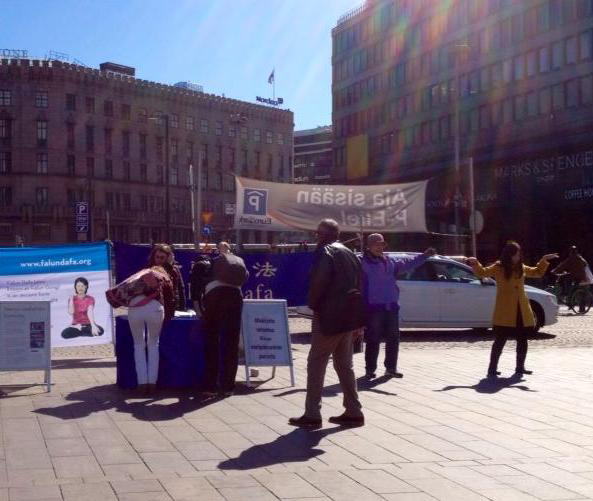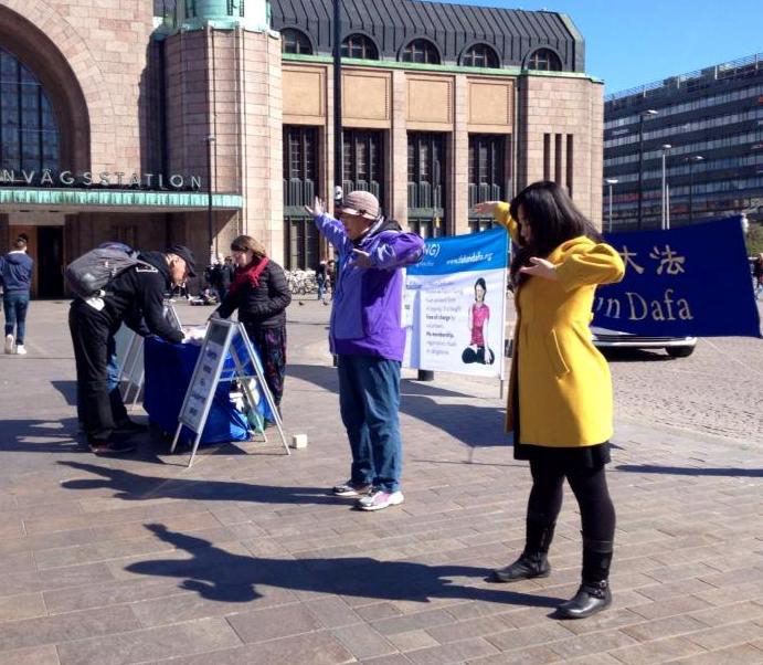 法轮功学员优美的炼功动作吸引路人观看。得知如此祥和的功法在中国遭到残酷迫害的详情,人们纷纷在反迫害征签表上签名。一些华人路过,看到法轮功学员,他们喜出望外,感叹芬兰也有人在炼法轮功。一个推车带孩子的华人女士在此经过,法轮功学员上前告诉她法轮功的真相并提及三退保平安的事,她高兴地三退(退出中共党、团、队,简称三退),并连声说“谢谢”。