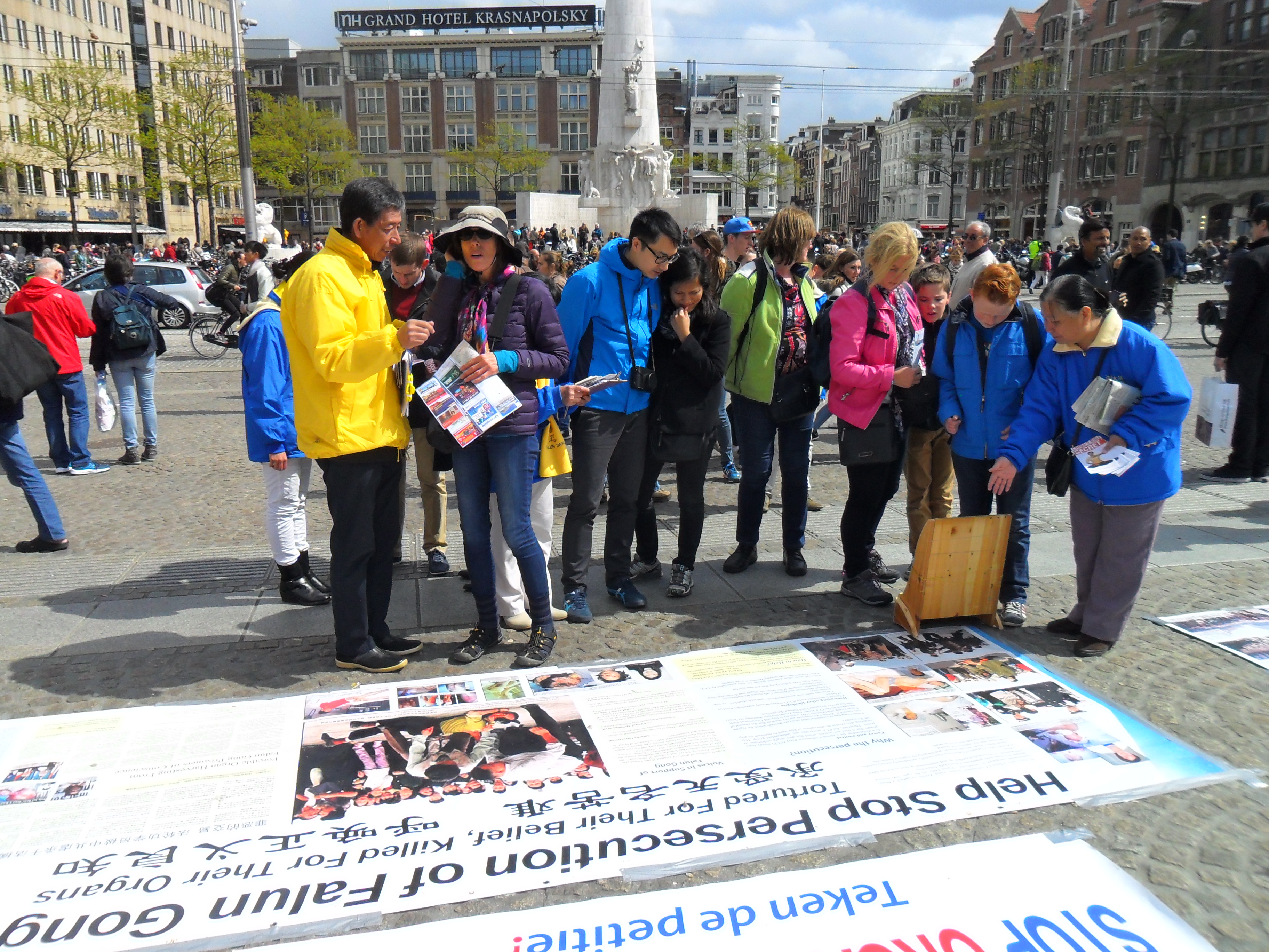 ![]() 阿姆斯特丹王宫前达姆广场上,游客认真阅读法轮功真相展板 |