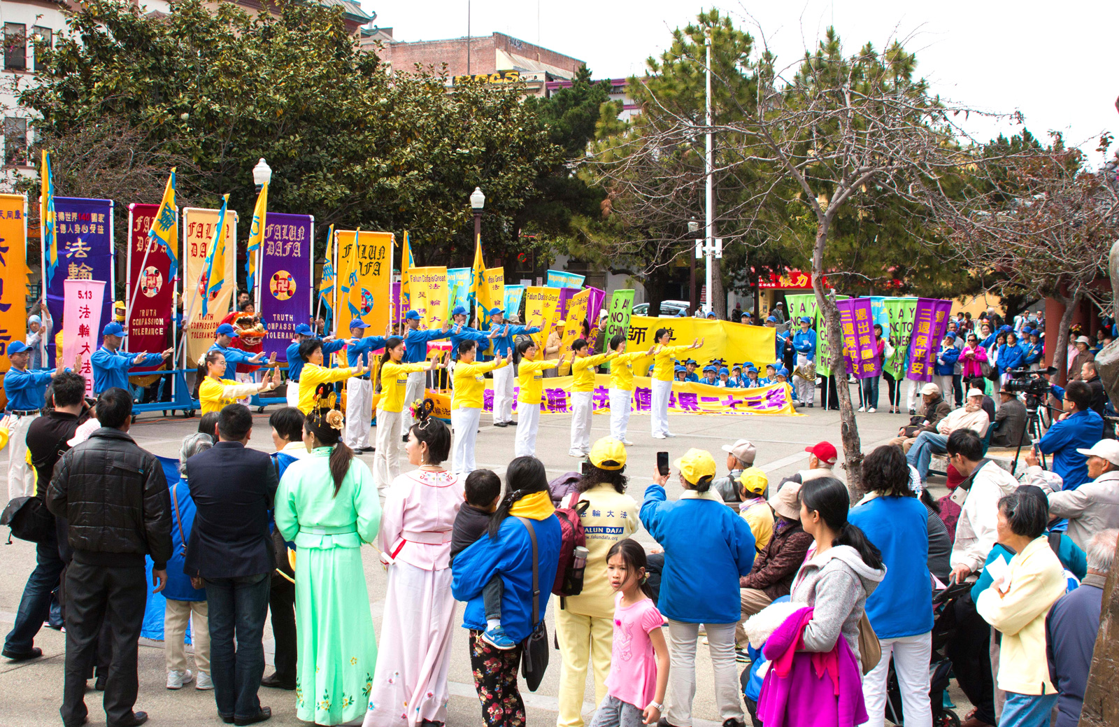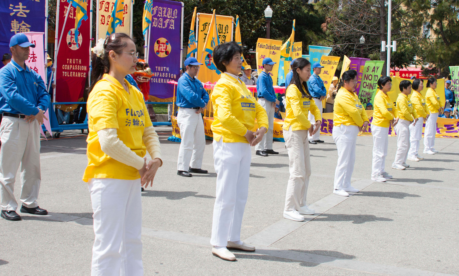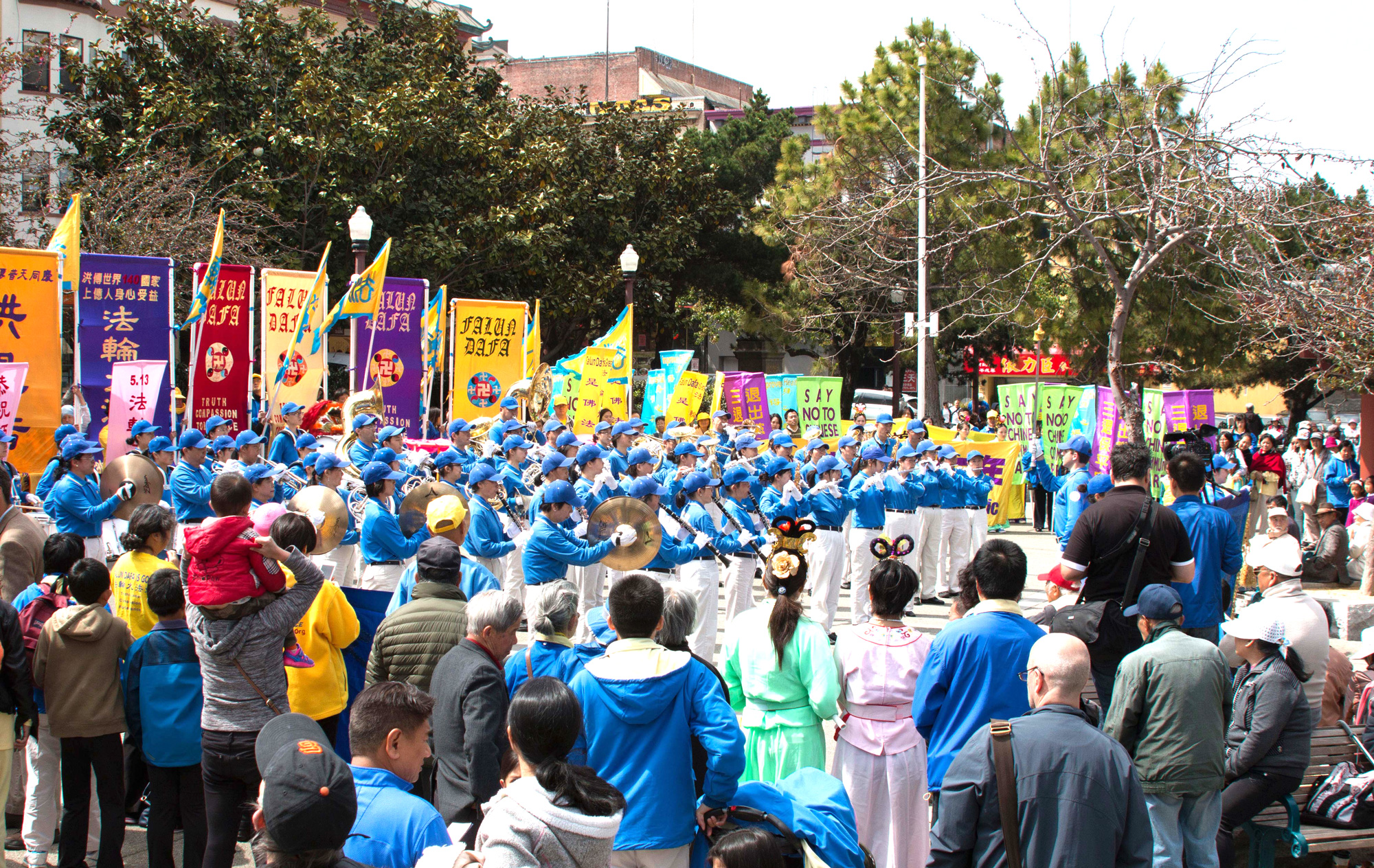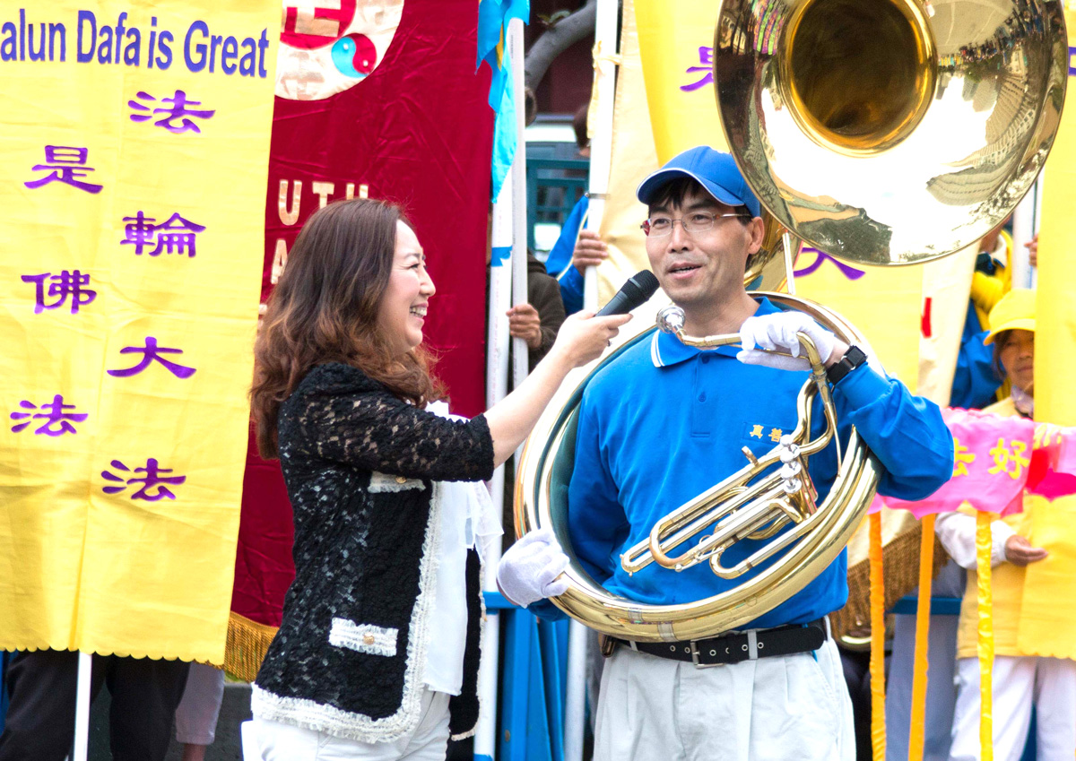 由法轮功学员组成的美西天国乐团演奏的法轮大法好等乐曲。雄壮的乐曲演奏赢得了现场观众的热烈掌声。乐团成员有很多硅谷工程师,他们在业余时间练习吹号。吹大号的乐团成员尚昌和是物理学博士。修炼前尚先生的身体很不好,患有失眠症、高血压和膝盖关节损伤等疾病。一九九五年在中国大陆接触法轮功后,他认为法轮功是从教导人从做好人做起,修炼自己,从而得到提高和升华。修炼法轮功后,疾病不治自愈。他希望大家都来了解法轮功真相。