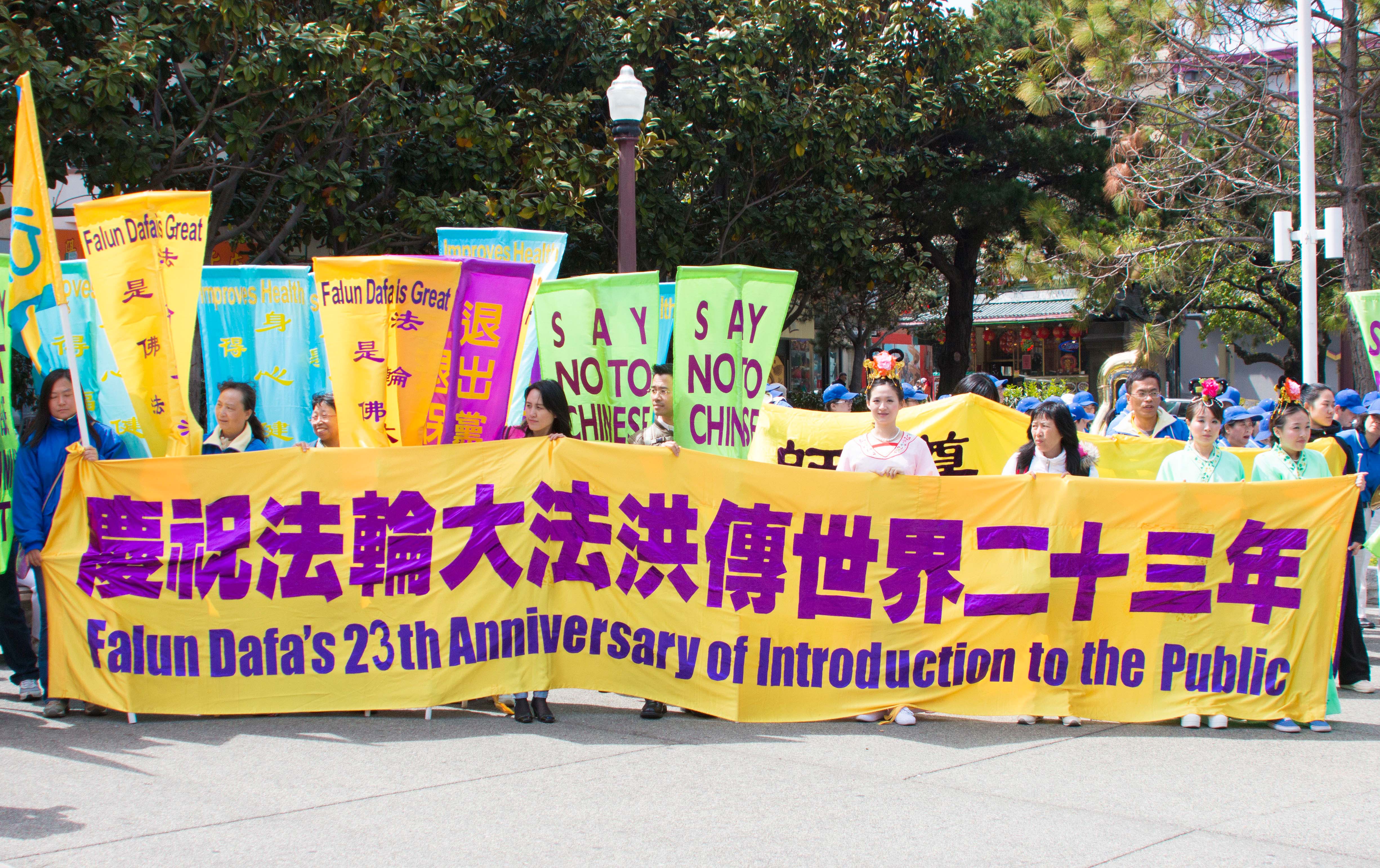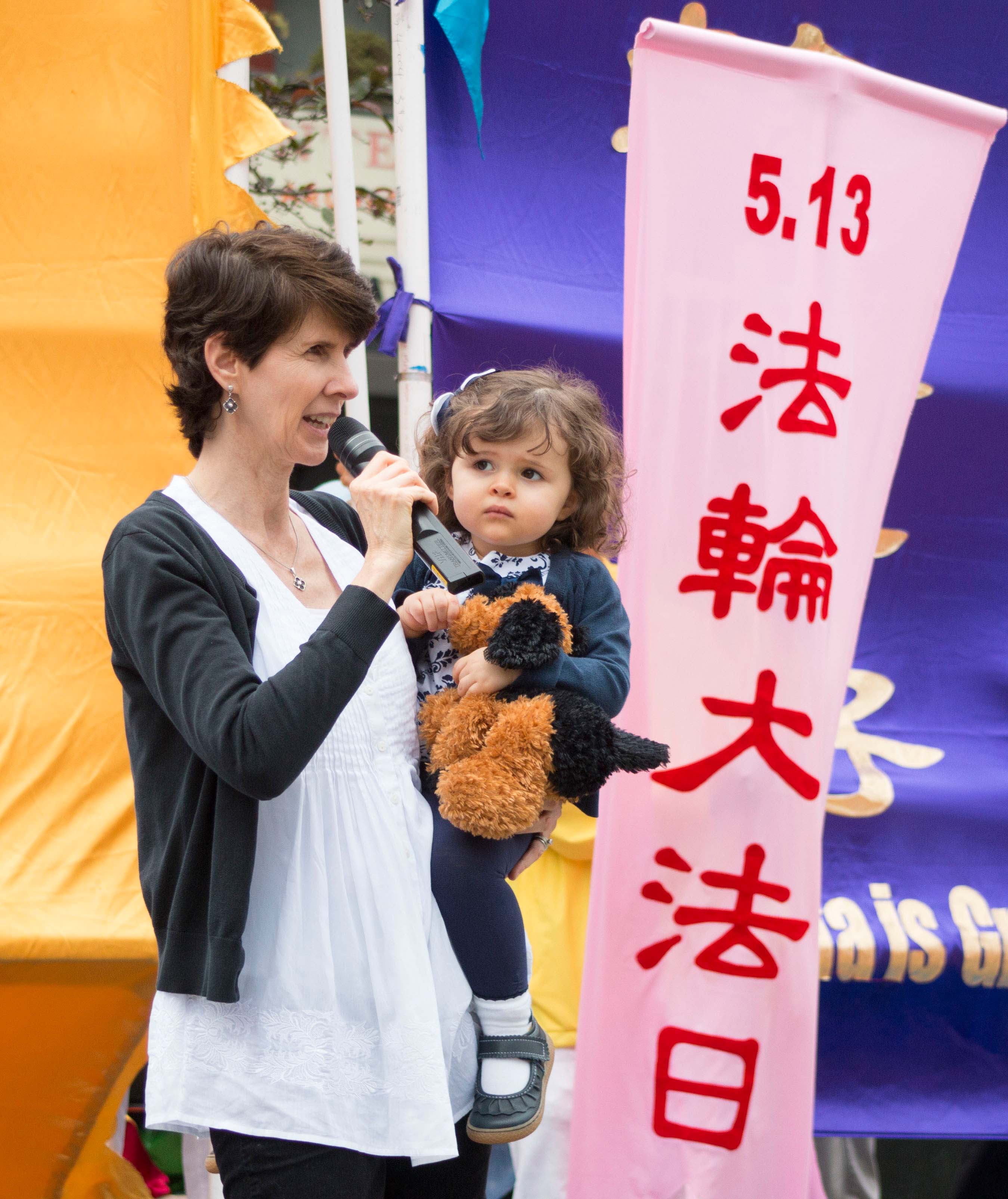 集会主持人高洁表示,今年的五月十三日是法轮大法传世二十三周年的纪念日,同时也是法轮大法创始人李洪志先生的六十四岁华诞。每年的五月十三日,各个国家的法轮功学员,都会以自己的方式庆祝世界法轮大法日。今天,旧金山的法轮功学员和世界各地的法轮功学员一样,向李洪志师父表示我们最崇高的感恩和敬意。同时我们也希望更多的朋友们了解法轮功是什么,象法轮功学员一样,得法、祛病健身,做一个更好的人。