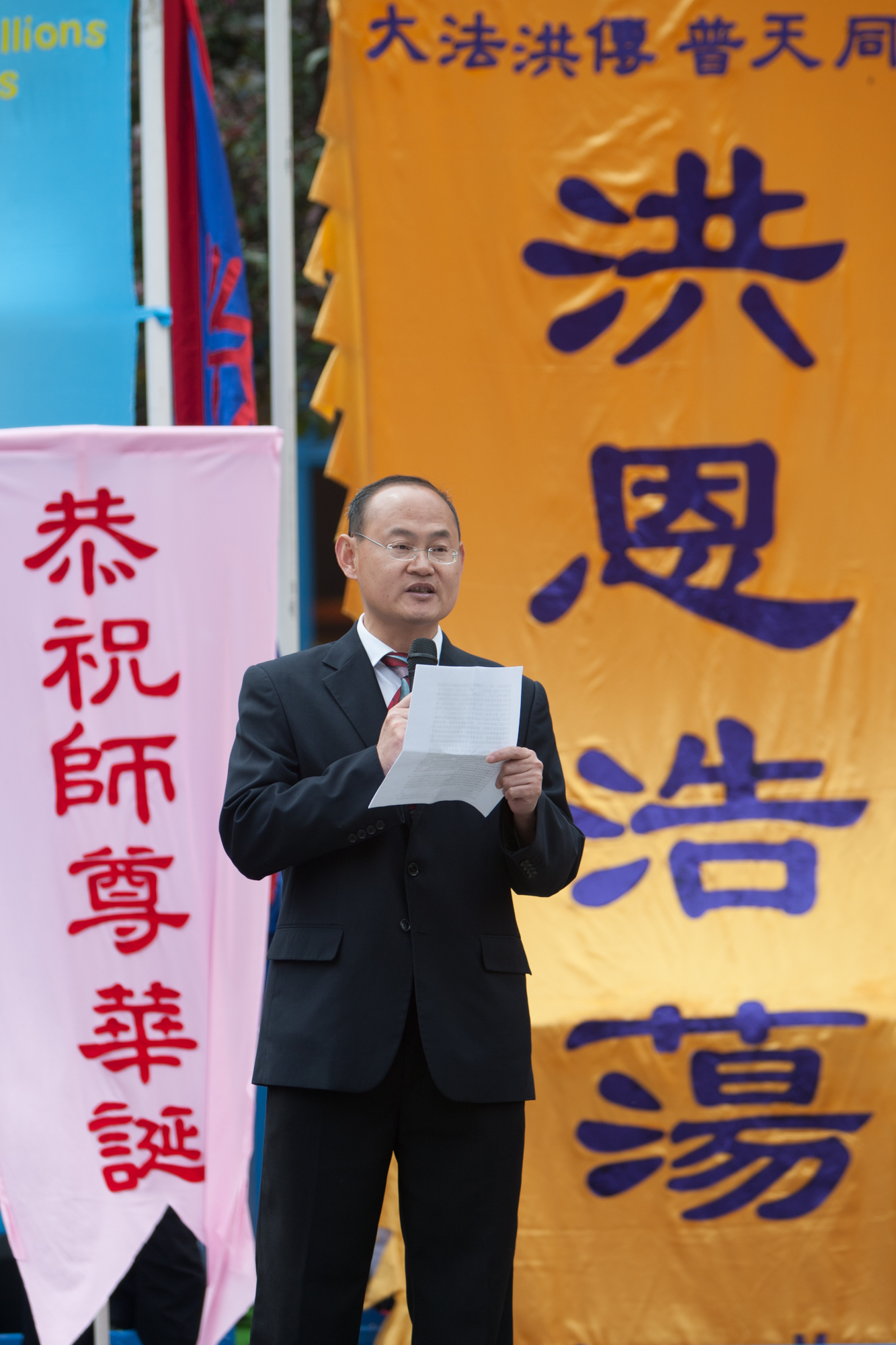 ![]() 图:集会主持人在介绍世界法轮大法日的来历 |