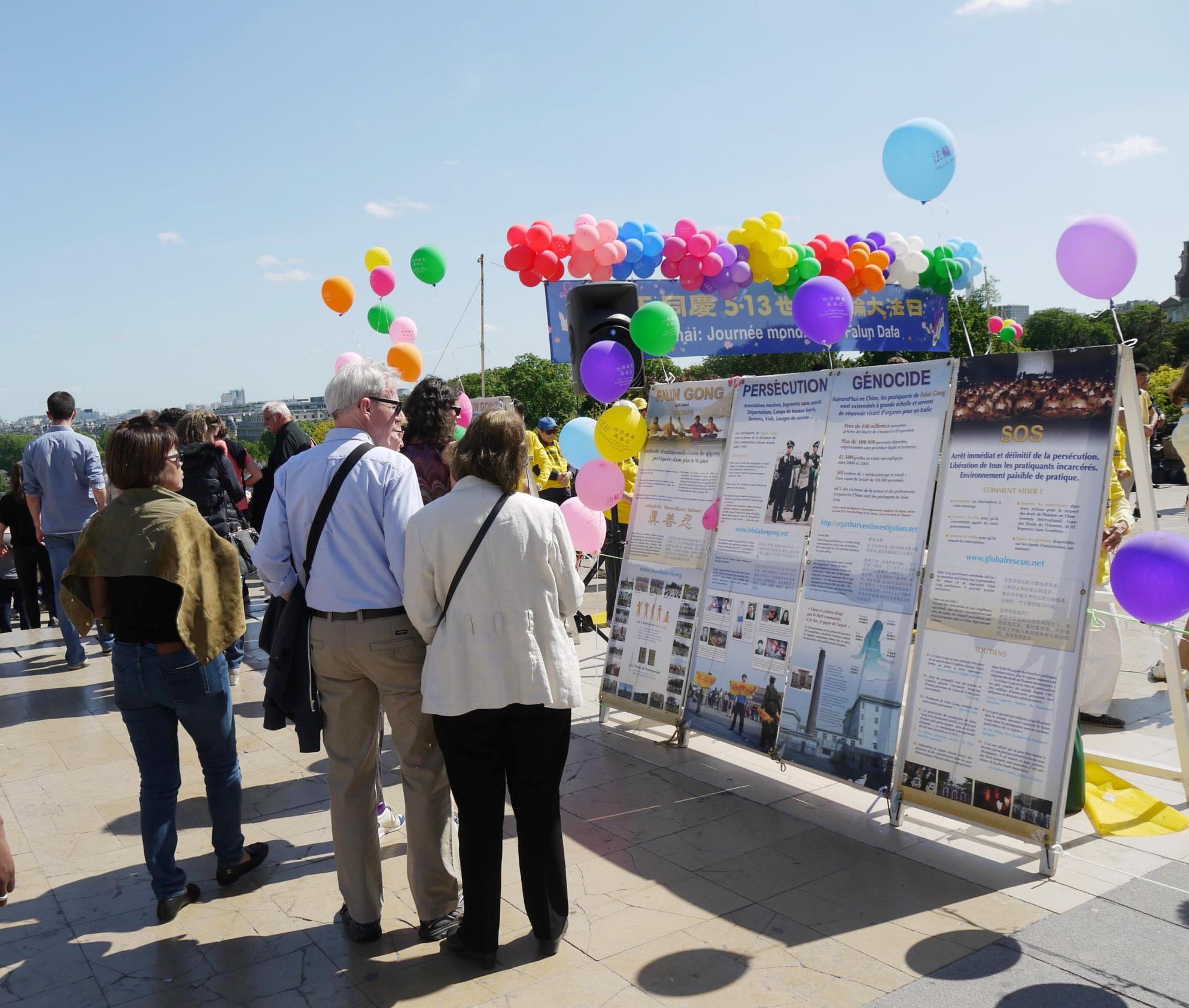 这一天,风和日丽,人权广场气氛祥和,没有往日的嘈杂和喧闹。法轮功学员在人权广场的炼功和优美的音乐舞蹈表演活动,吸引了巴黎的民众和游人驻足观看。表演功法的同时,他们用法文和英文介绍法轮功功法,并邀请观众参加炼功。被功法吸引的民众当场加入了炼功队列。