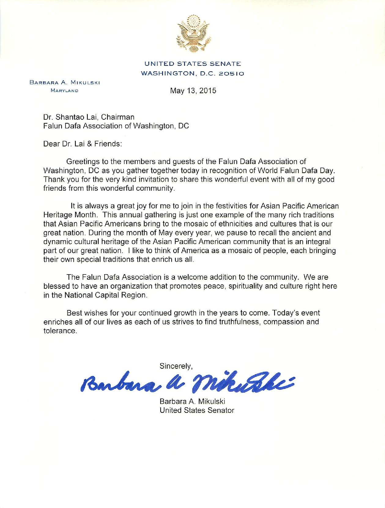 【明慧网二零一五年五月十四日】美国参议员芭芭拉·米库斯基致信华盛顿DC法轮大法学会,“对华盛顿DC法轮大法学会的成员以及来参加世界法轮大法日庆祝的的客人们表示问候”,并表示“所有人的生活因对于发现“真、善、忍”的追求而更加充实。”