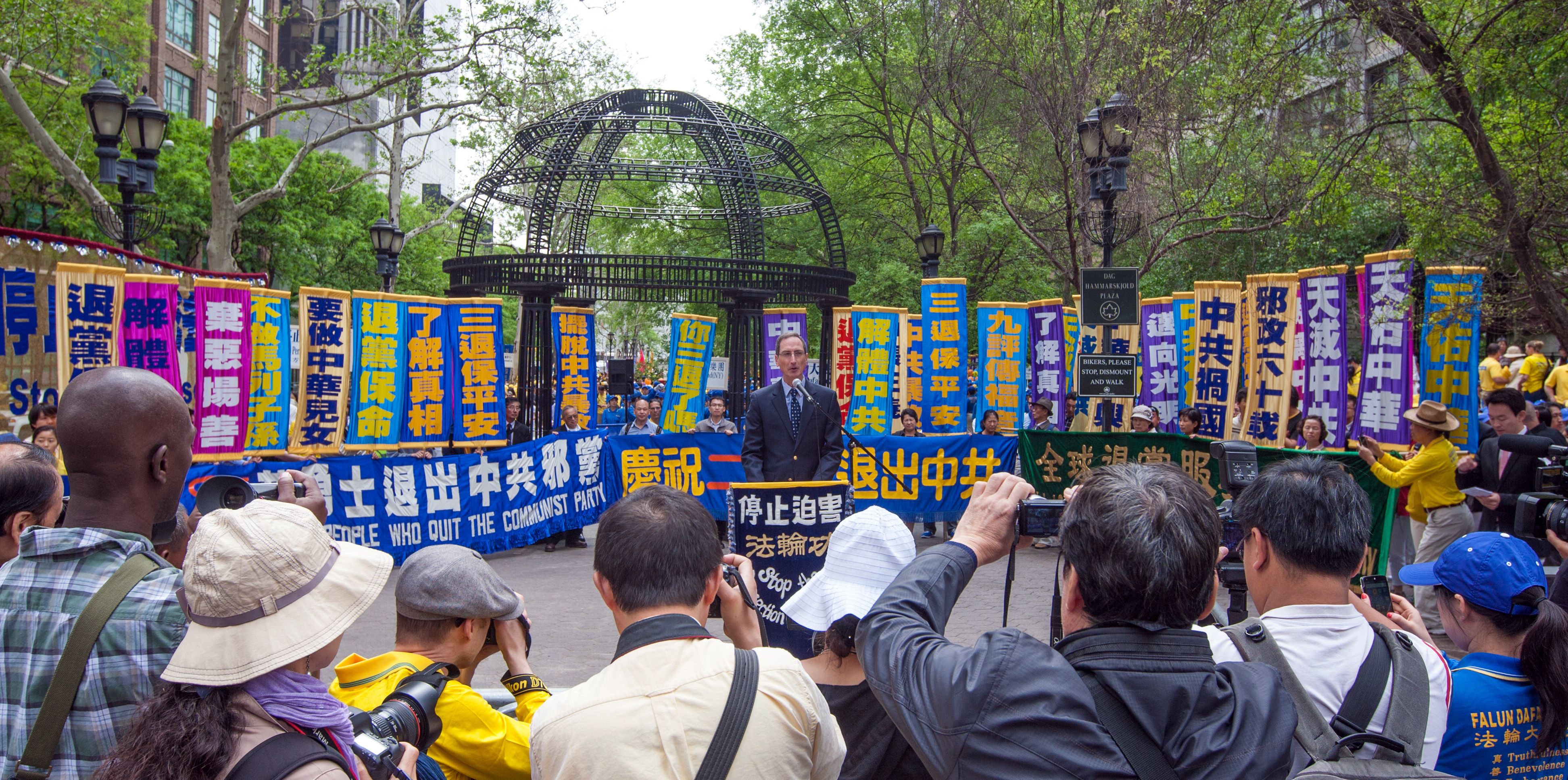 游行开始前,全球退出中共服务中心于上午十点在公园面对联合国总部的广场举行了盛大集会,主题是“解体中共,结束迫害,声援二亿中国人退出中共”。法轮大法信息中心发言人张而平先生、德国国际人权会社理事吴文昕先生、香港法轮大法学会会长简鸿章先生、全球退出中共服务中心主席易蓉女士、台湾法轮大法学会理事长张锦华女士、亚洲家庭联盟主任泰勒(Jeremy Taylor)先生、英文《大纪元》主编纳尼亚(John Nania)先生等先后在集会上发言。