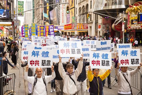 游行队伍于中午时分从联合国出发,穿越时代广场,到达中领馆所在地,引起川流不息的人群驻足观看。