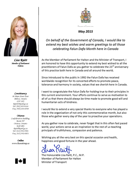 联邦交通部长、国会议员丽莎•雷蒂(Lisa Raitt)也已连续多年发来贺信。在今年的贺信中,雷蒂部长说:“谨代表加拿大政府,我在此向所有参与加拿大‘法轮大法月’庆祝活动的人们表示最衷心和热烈的祝贺。”