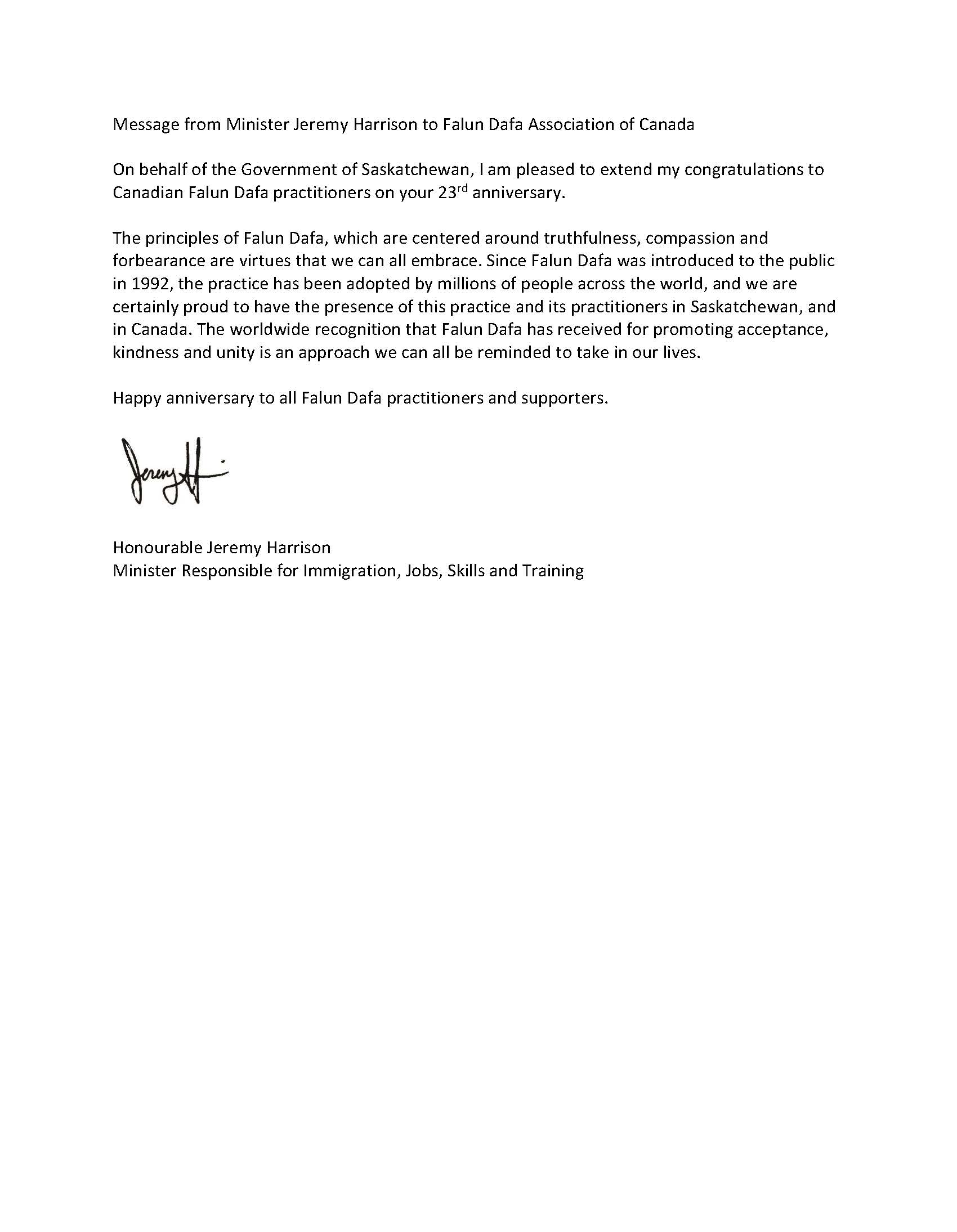 萨斯喀彻温省移民、就业、技能和培训部部长杰瑞米·哈瑞森(Jeremy Harrison)先生在贺信中说:“我很高兴代表萨斯喀彻温省政府,在法轮大法洪传二十三周年之际,向加拿大法轮功学员致贺。法轮大法以‘真善忍’原则为中心,这是我们所有人都能接受的美德。法轮大法于一九九二年洪传于世,在全世界,已有数以百万计的人修炼法轮大法。”