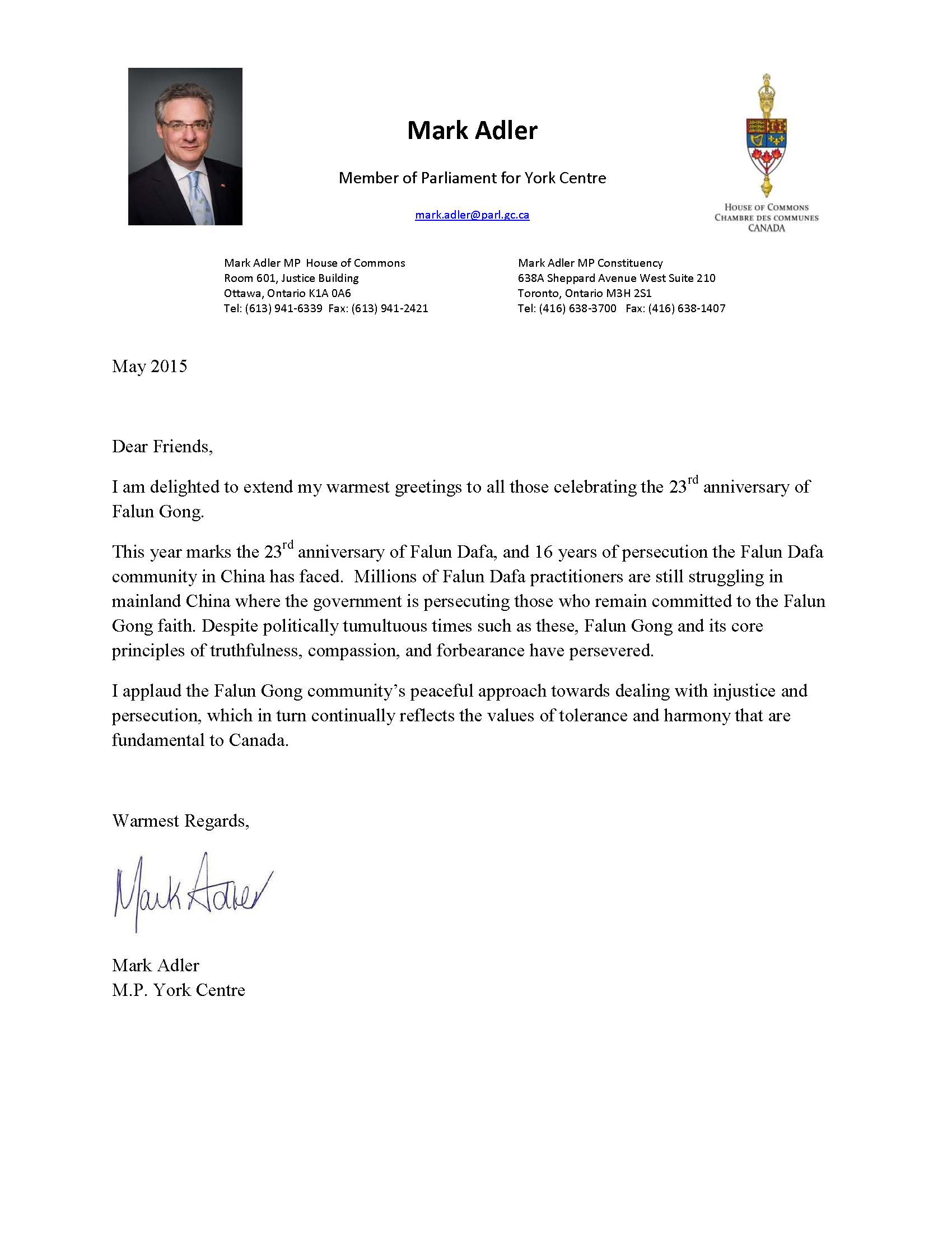 国会议员 马克·艾德勒(Mark Adler)在贺信中说:“我向庆祝法轮大法洪传二十三周年的人们致以最热诚的问候。今年是法轮大法洪传二十三周年,也是在中国法轮大法(学员)遭受迫害十六周年。在中国大陆,中共仍在迫害那些坚信法轮功的人们,数以百万计的法轮大法修炼者仍在抗争。”