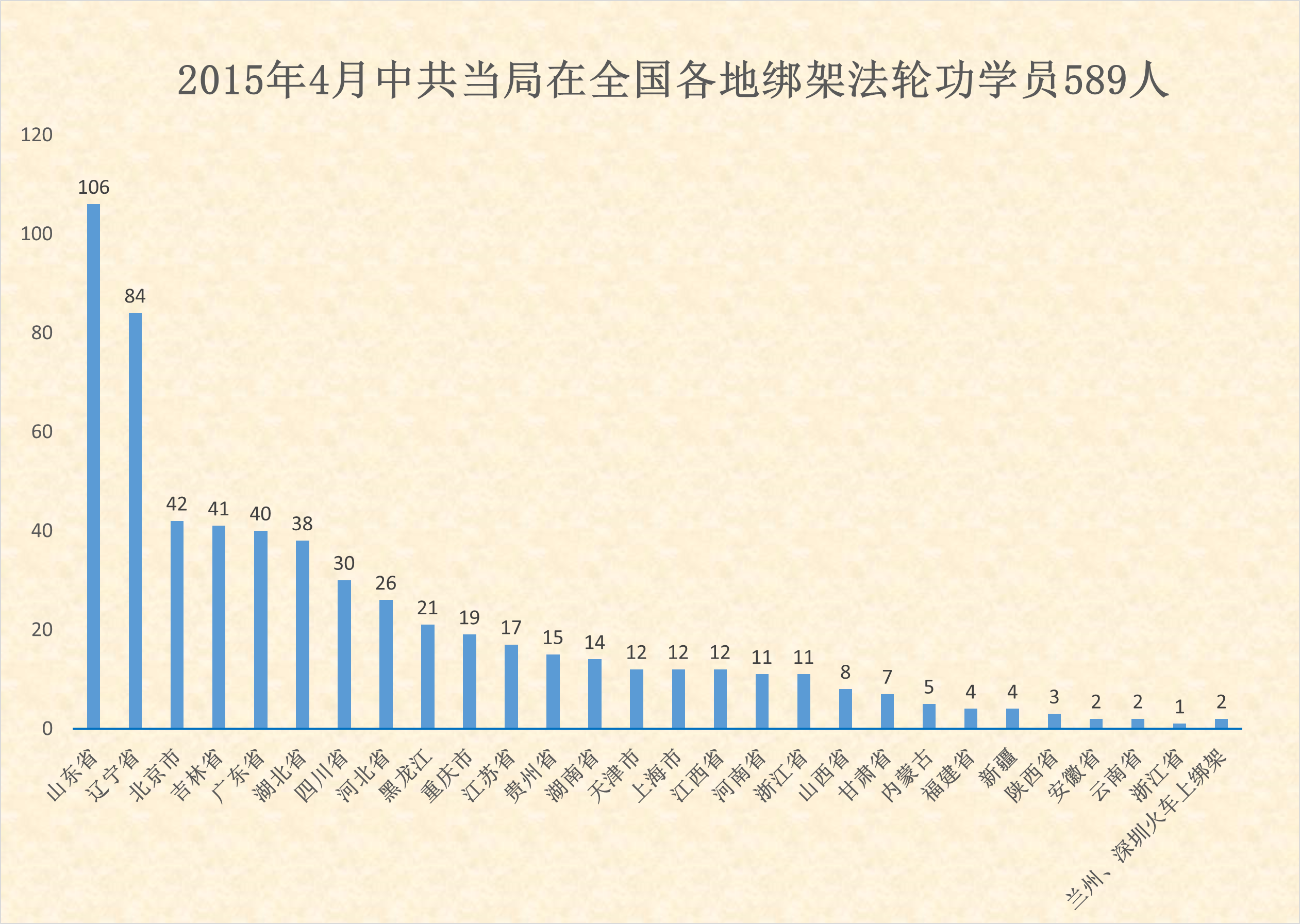 非法抓捕迫害最严重的省、直辖市依次是:山东106人、辽宁84人、北京35人、吉林41人、广东40人、湖北38人、四川30人、河北26人、黑龙江21人、重庆19人;最严重的城市依次是:丹东市44人、潍坊市36人、深圳市23人、聊城市17人、沈阳市15人、长春市15人、武汉市15人、泰安市10人等。南京市88岁高龄的宋乐先老先生也被恶警绑架(后放出)。