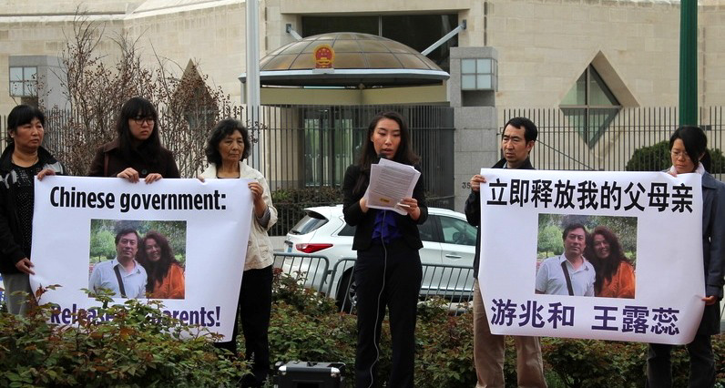 四月三十日傍晚,这位生活在美国首都华盛顿的二十三岁女孩游天黛来到中国驻美国大使馆前,要求中共释放在北京家中被绑架的父母。游天黛的父亲游兆和是中国政法大学人文学院哲学系教授,母亲王露蕤曾是北京天坛医院老干部处的干部。原本体弱多病的王露蕤在修炼法轮功后,所有的疾病都不翼而飞。