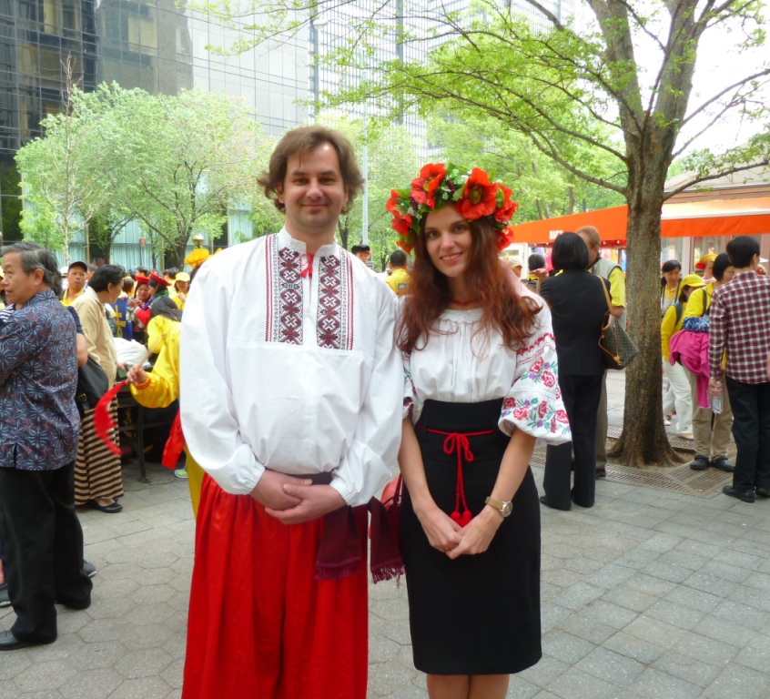 身穿民族盛装的青年乌克兰法轮功学员Euggen Bfug和妻子Totiong Stou很高兴参加世界法轮大法日活动。漂亮的服装和容光焕发的气质格外引人注目。Euggen很开朗健谈,谈起他的修炼前后的变化滔滔不绝,内心充满对师父和法轮大法的感恩,是师父把他从人生的困境中救出。修炼前的他,抽烟喝酒,现代社会中的不好习惯沾染一身。他也曾经想改变自己这种状态,曾在宗教中寻找和习练瑜伽,但是感觉对自己帮助不大,每天照常吸烟喝酒。