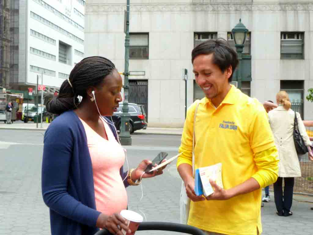 来自秘鲁的建筑工程师Maolixiu拥有一家公司,他在路上热情地给路人发法轮功真相资料,脸上洋溢着发自内心的喜悦。他修炼七年了。他说:“我修炼法轮功是因为我一直想知道我是谁?在我读大学的时候,一个朋友向我介绍了法轮大法。他告诉我如果你修炼法轮大法你就会知道你是谁,你生命的意义是什么了。修炼后使得我内心感到很充实,很快乐,很健康,最重要的是,修炼后我能够更善良,而且能够感染自己周围的人。我希望能够让更多的人受益于法轮大法,象我一样幸福。”