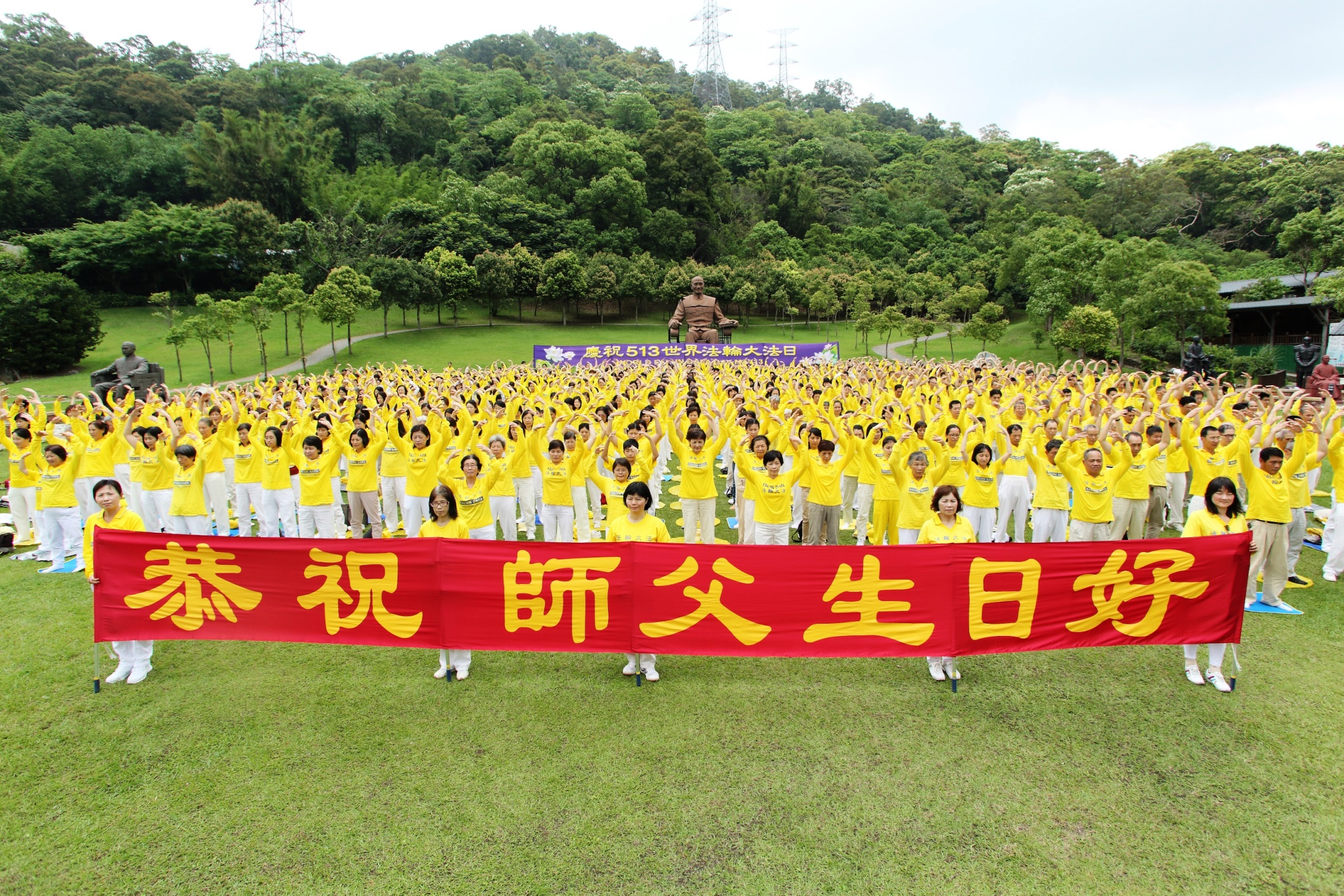 ![]() 图1:桃竹苗提前欢庆五一三世界法轮大法日,法轮功学员在慈湖集体炼功。 |
