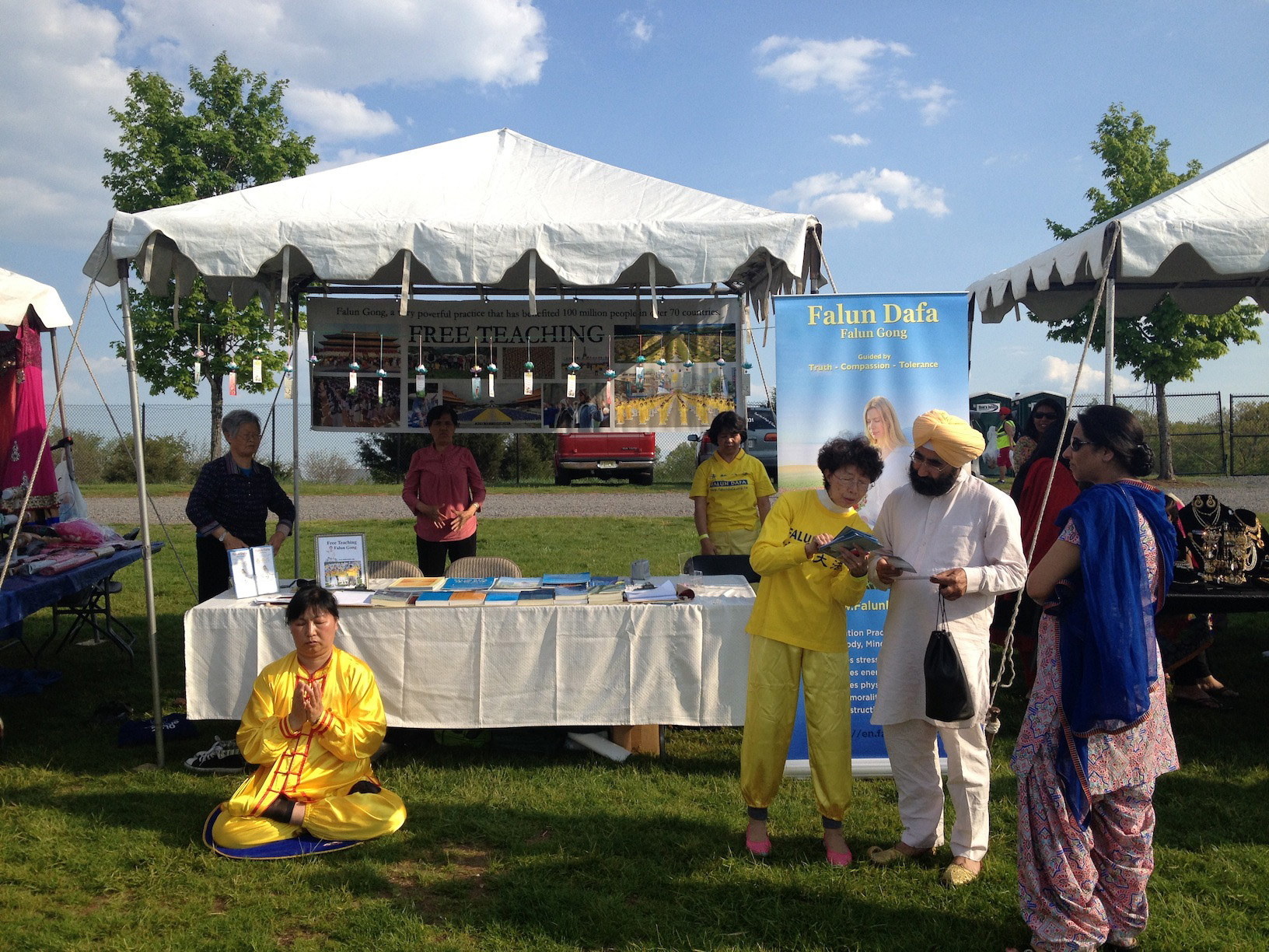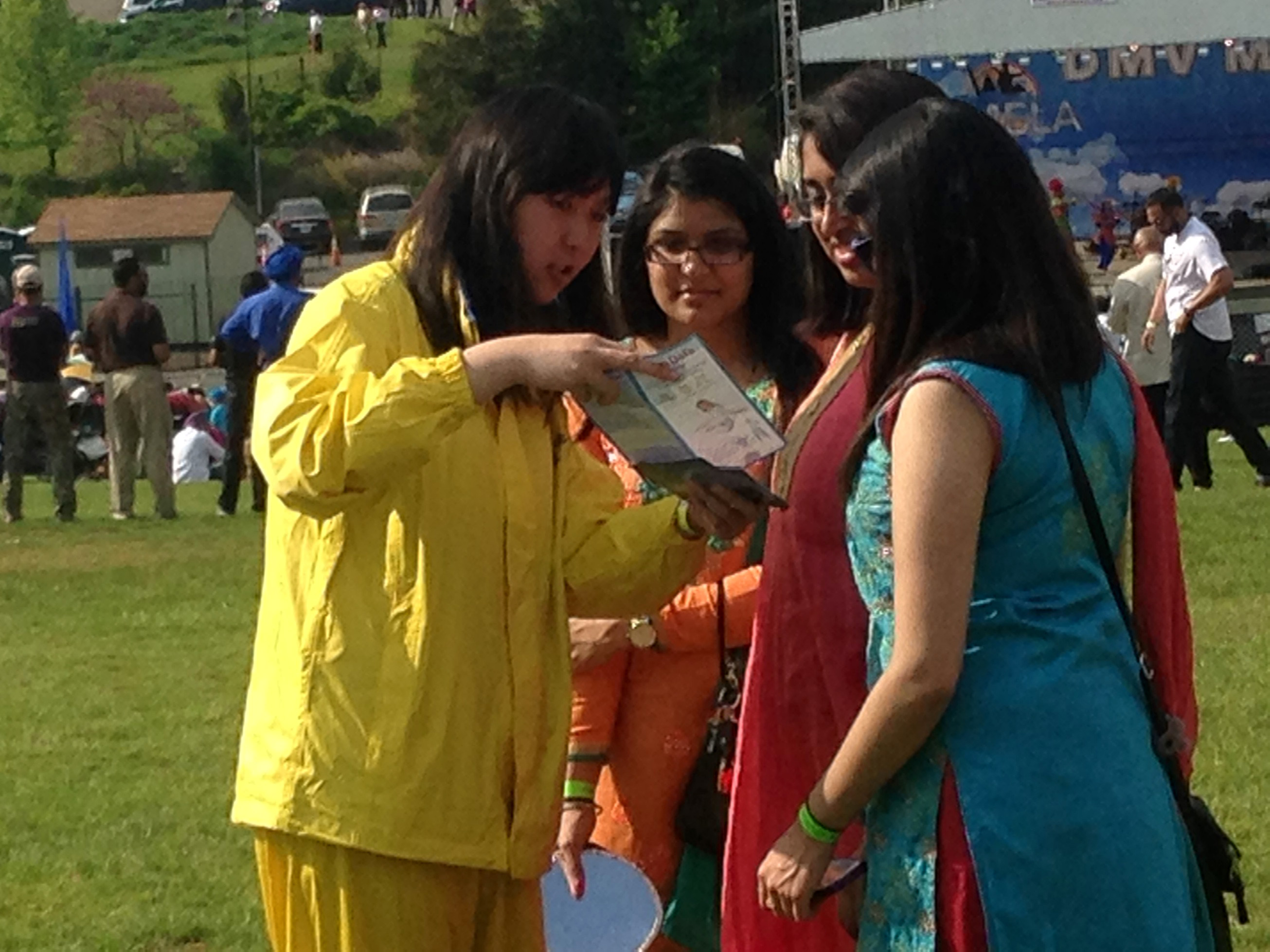 大华府地区的法轮功学员也在那里摆了一个摊位,向印度民众介绍法轮功,展位前的功法演示吸引了大量人群驻足观看,许多人纷纷拿出相机为功法演示的学员拍照。