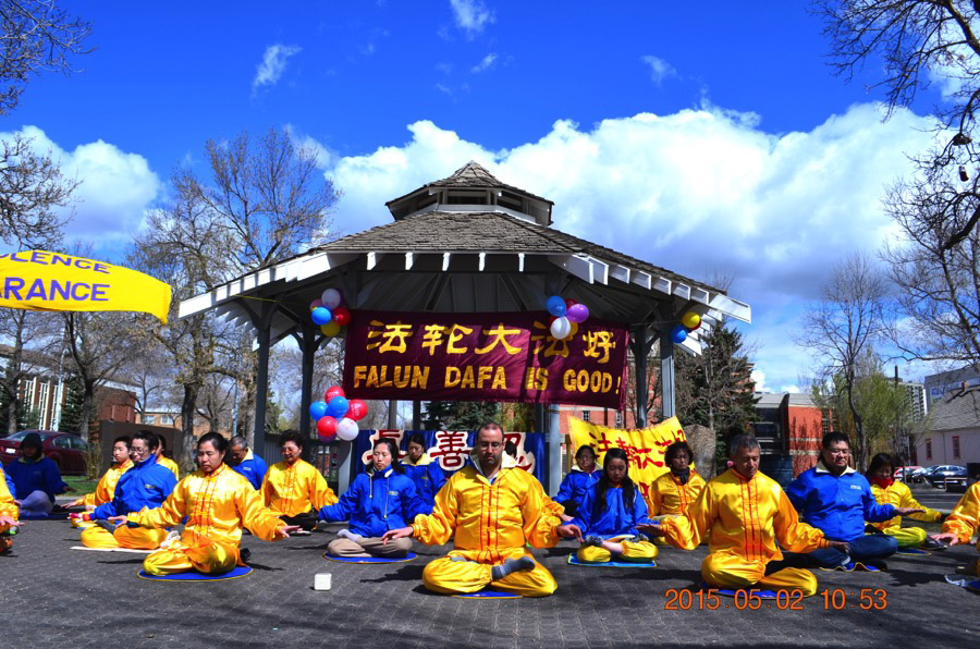 五月二日,加拿大埃德蒙顿部份法轮功学员在凉亭公园举行庆祝活动,并向民众介绍法轮大法的美好。