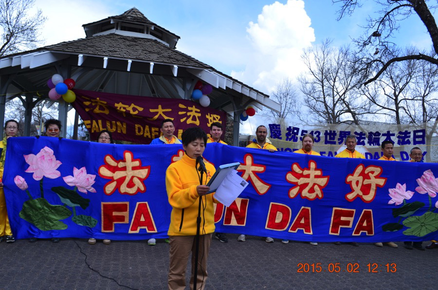 接着,法轮功学员举行了庆祝大法弘传二十三周年的集会。集会上,主持人叶先生介绍了法轮大法自一九九二年五月开传以来,在二十三年中,传遍世界一百多个国家,使上亿人身心受益——身体健康、道德升华,从而受到许多国家和政府的褒奖。他还介绍说,加拿大三级政府每年都在五月褒奖法轮大法并发来贺信。西人学员欧米德(Omid)在集会上介绍了法轮大法使人身心受益的实例。当地法轮大法协会负责人黄女士宣读了来自埃德蒙顿市政府的褒奖和三位国会议员发来的贺信。