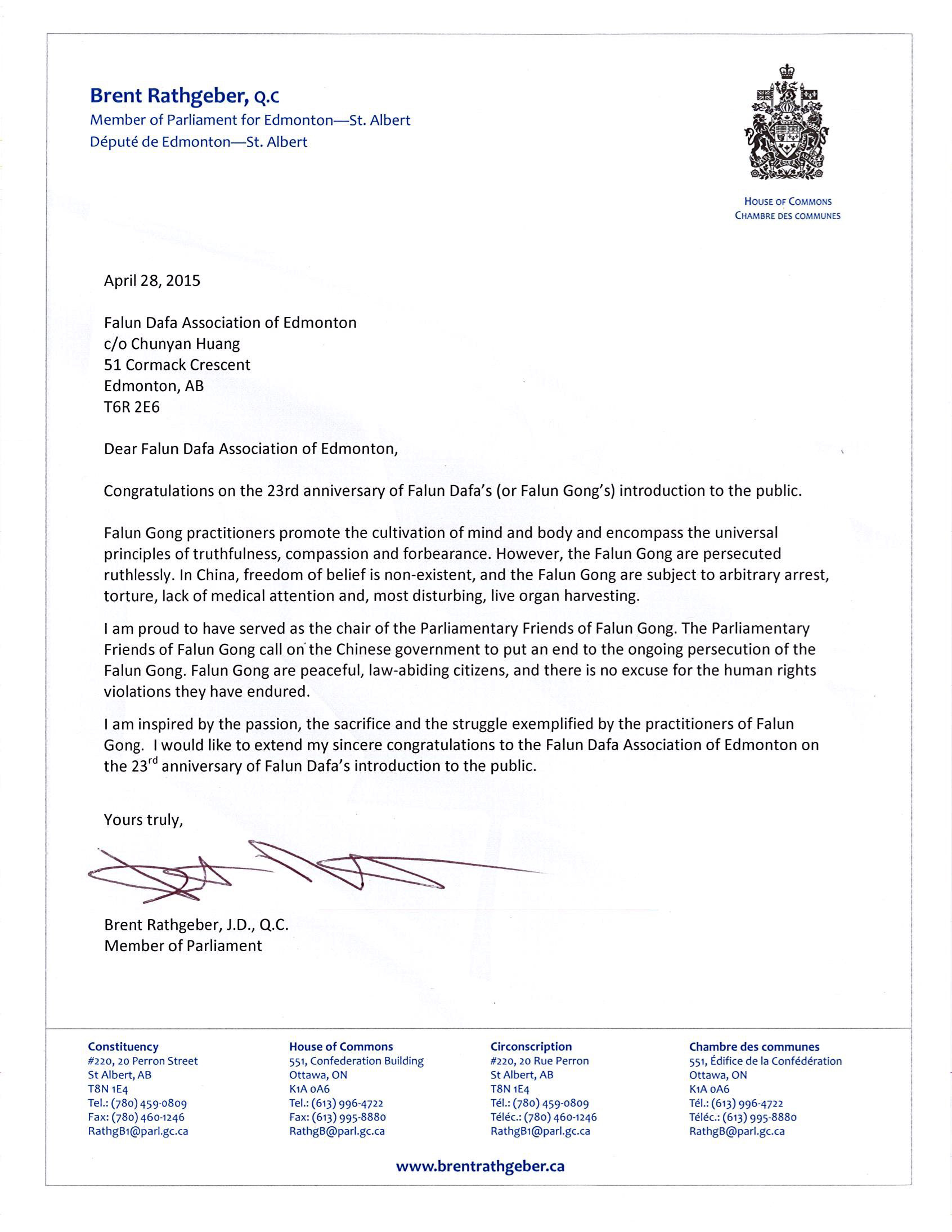加拿大国会议员Brent Rathgeber致信法轮大法协会译文如下: