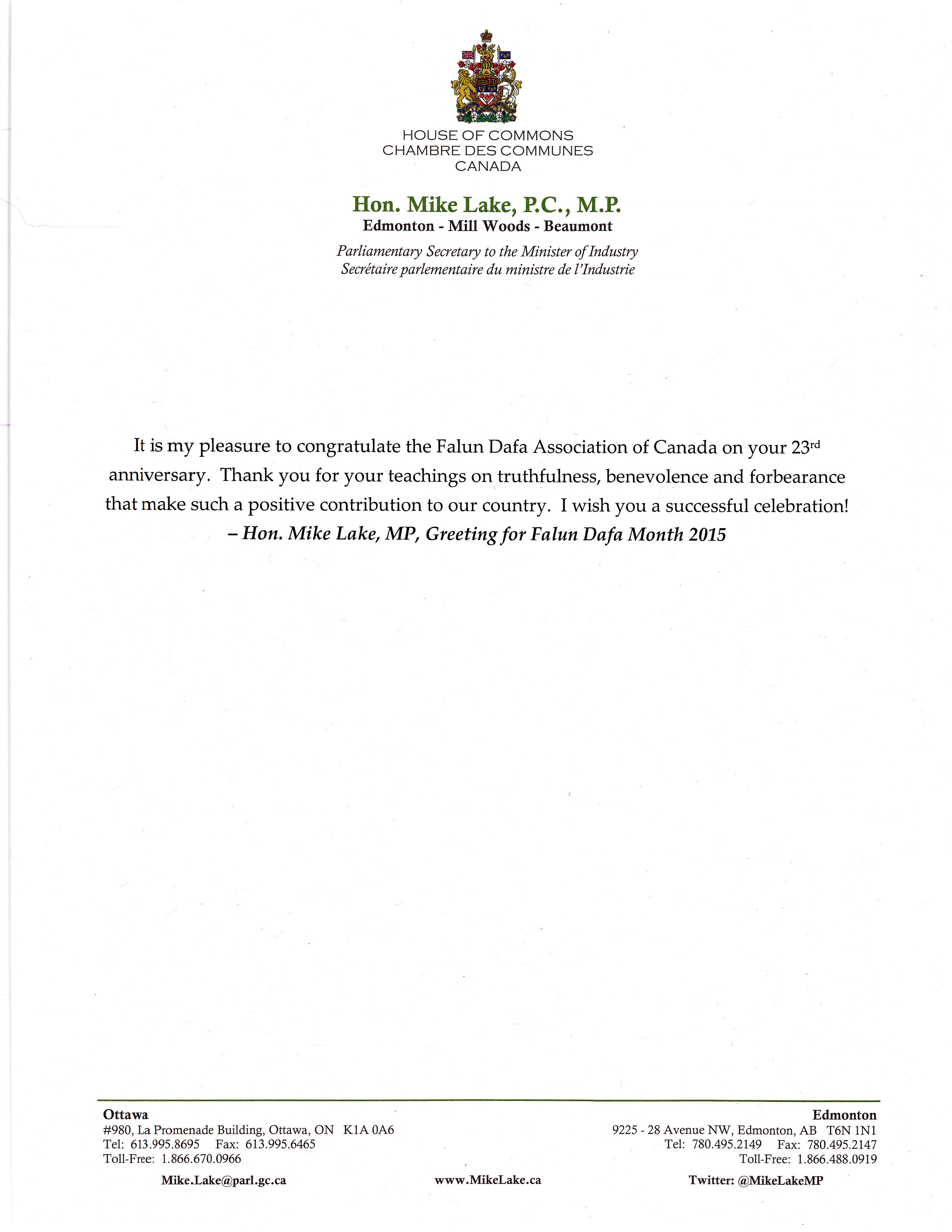 加拿大国会议员Mike Lake 致信法轮大法协会译文如下: