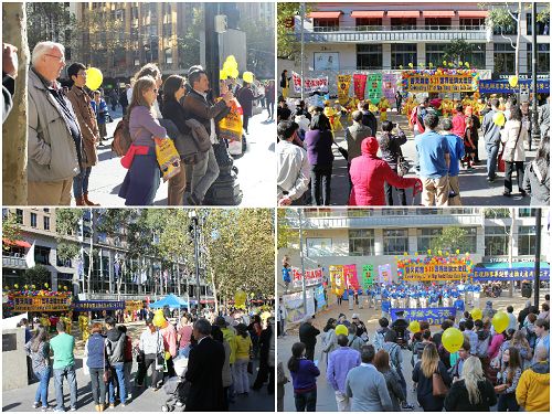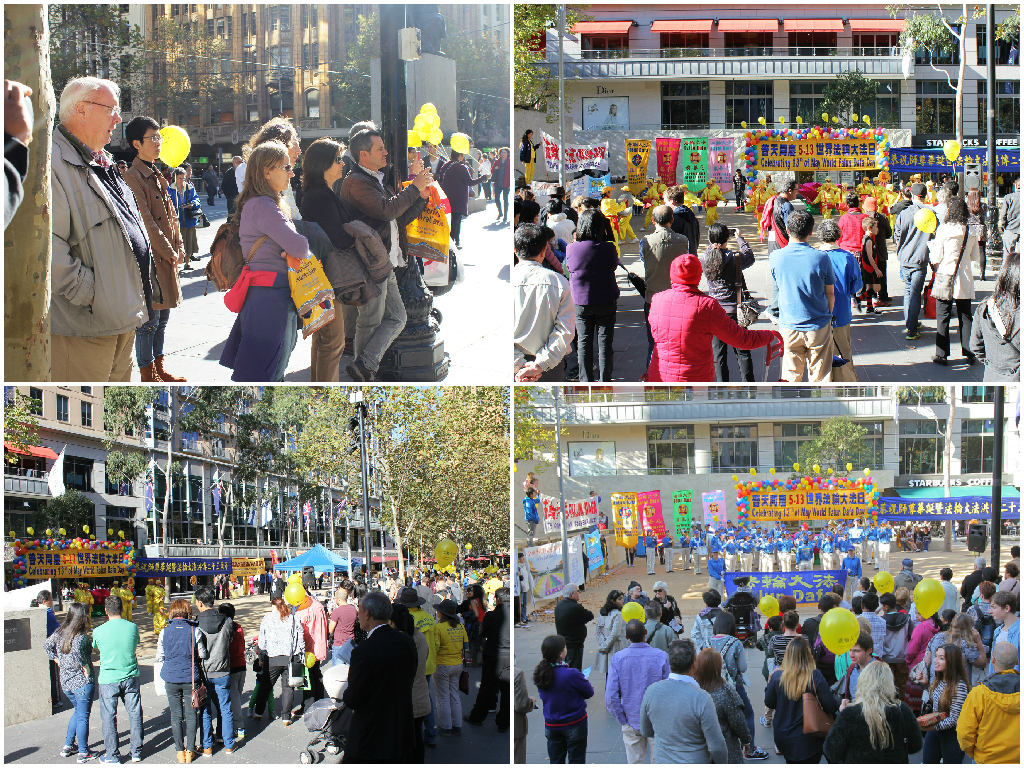 天公作美,明丽的阳光让深秋的墨尔本又回到了夏末般的凉爽宜人。色彩缤纷的气球、醒目的横幅令位于墨尔本市中心的城市广场沉浸在节日欢快的气氛中。从威武雄壮的天国乐团的演奏,到稚嫩清甜的明慧学校法轮功小弟子的合唱,从曼妙的少女彩带双人舞到振奋人心的传统腰鼓表演,还有优美祥和的法轮功五套功法演炼,墨尔本中西各族裔法轮功学员向世人展示了法轮大法的美好。