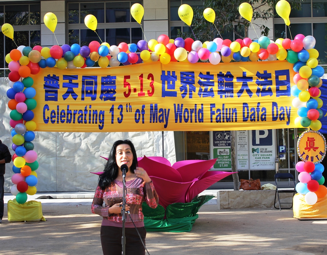 墨尔本《天安门时报》社社长兼总编辑阮杰先生在发言中说:“16年来我作为一名普通的中国人,我也不炼法轮功,我始终支持他们,因为我认为不仅仅是支持法轮功,我觉得这个意义要大得多。支持法轮功的修炼,更重要的意义是支持我们每个人的基本权利──信仰自由的权利。支持法轮功还有一个更重要的意义就是我们人类该崇尚的文明━真善忍的普世价值。支持法轮功对于支持我们中国未来是有重大的意义的。你可以不修炼法轮功,但是你一定要认同真善忍,要支持法轮功修炼者为信仰自由抗争。”