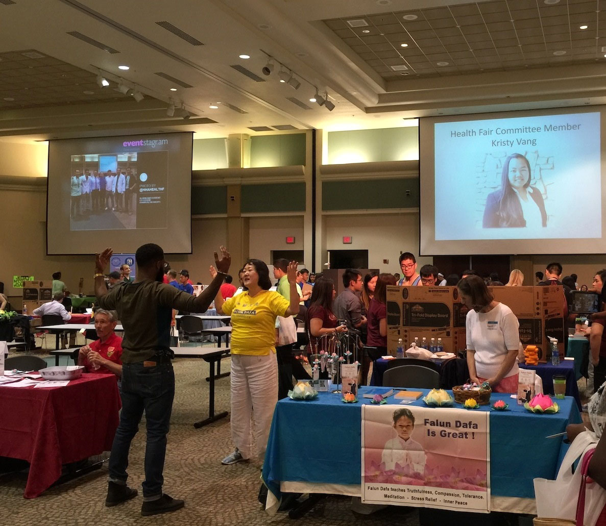 苗族裔美国人是美国的一个亚裔族群, 主要是来自于东南亚老挝、越南或中国南方苗族后裔,参加活动的很多大学生来自于生活在美国的苗裔家庭。由于受传统文化和家庭环境的影响,不少人对佛家的修炼方式有一种与生俱来的亲切感,一看到横幅上打坐的小女孩就情不自禁地被吸引过来。