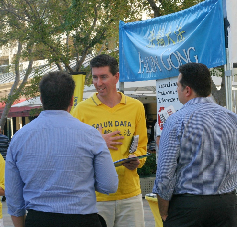![]() 西澳企业家马克.哈奇森(中)向民众介绍法轮功 |