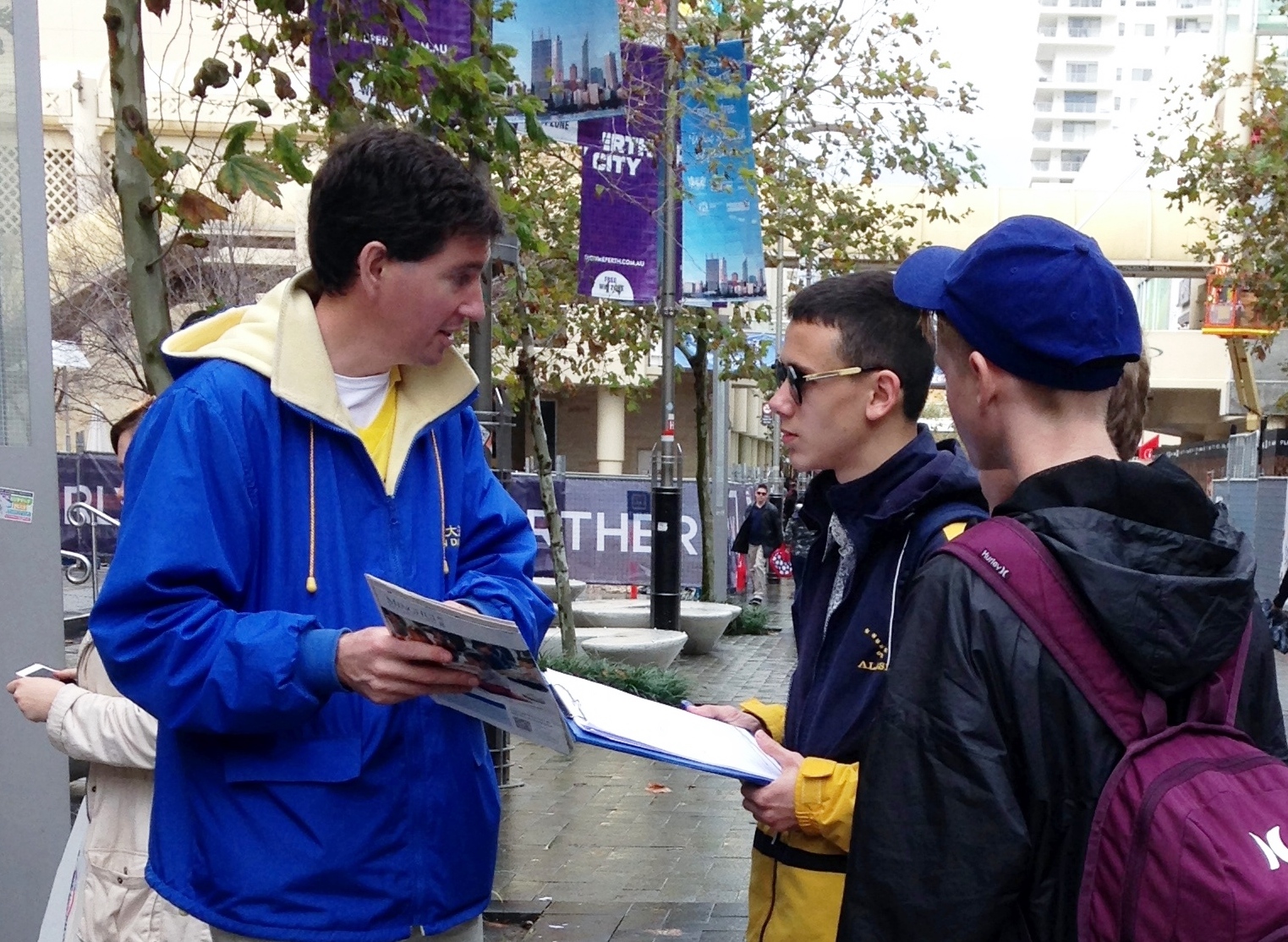![]() 西澳企业家马克.哈奇森(左)在街头向民众讲述法轮功真相 |