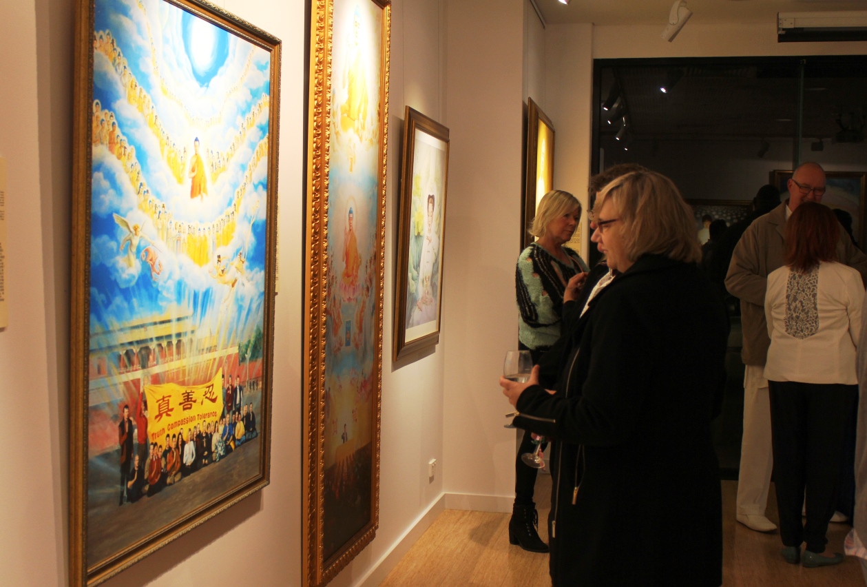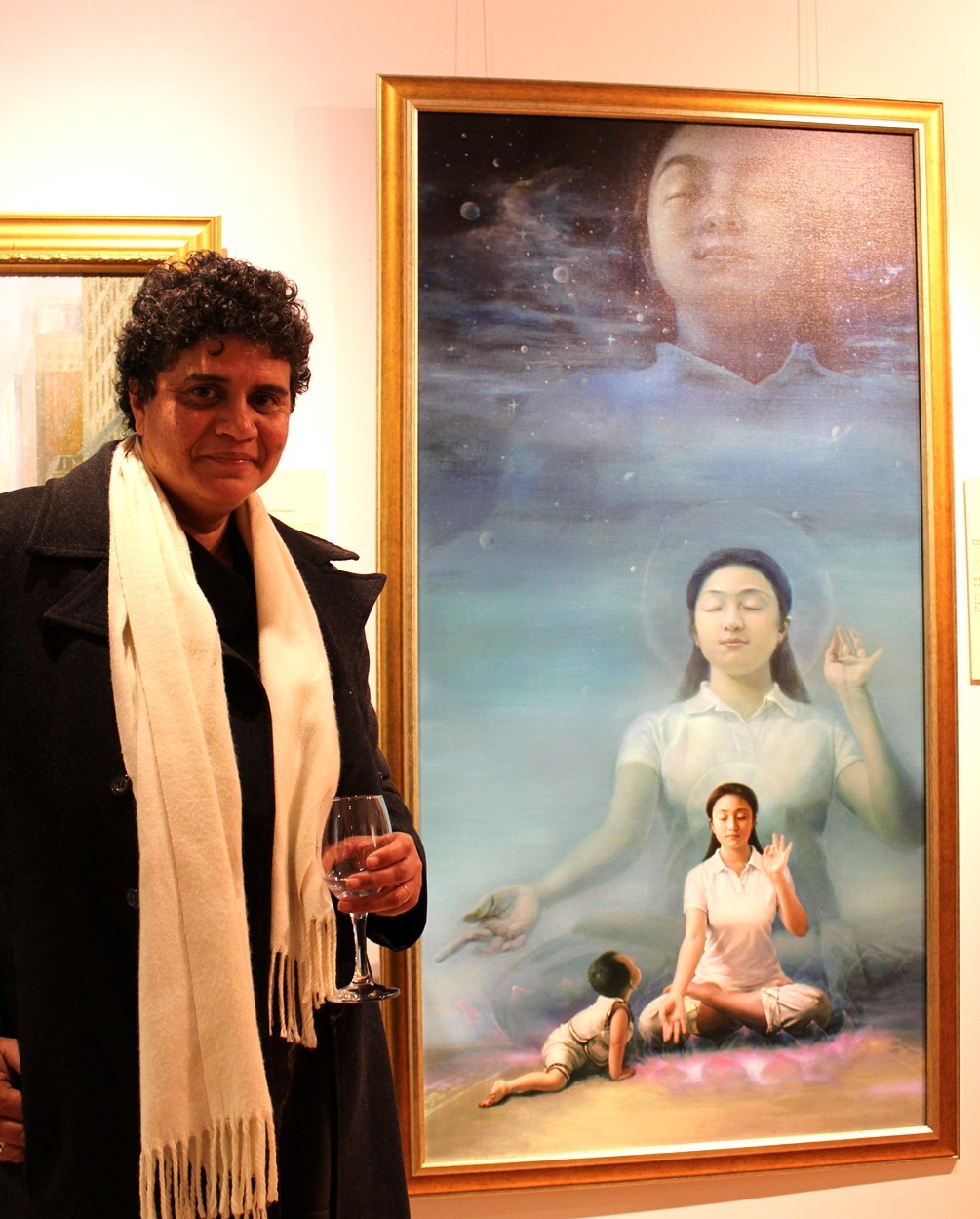 她说:“我原来不知道法轮功功法包含打坐,需要入定,虽然我们一直在谈论法轮功,但这些我都不知道,而今晚我(从画作中)看到也体验到了这一切。也明白了人们为何喜爱这种功法,那是因为这套功法将他们与神联系了起来。所有的一切在这个画展中清晰得展现出来!”