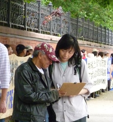 ![]() 当场有一百六十多位路人在征签表上签名,支持制止中共政府活摘法轮功学员器官 |