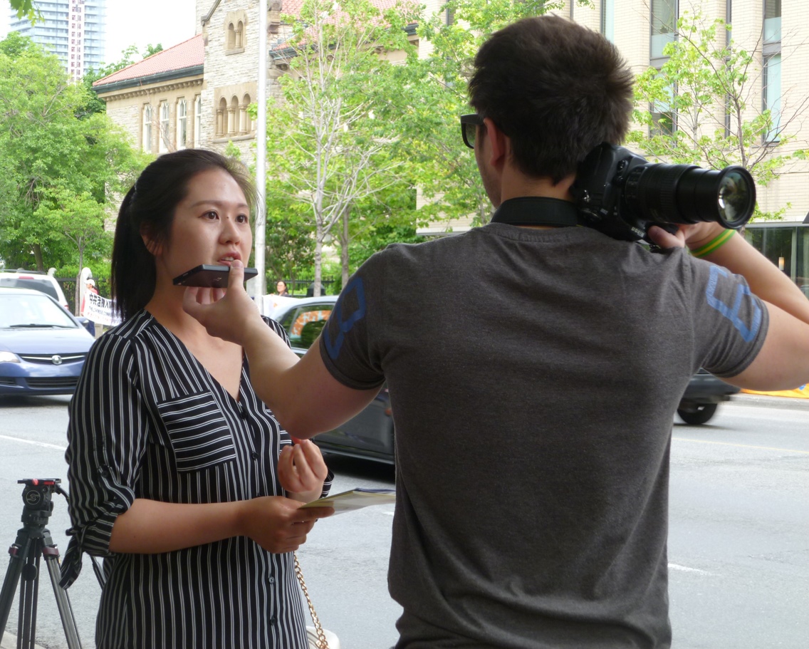 一位原意大利专业记者、现在加拿大的自由撰稿人经过活动现场,被现场的气氛吸引,他停下来拍照,与法轮功学员交谈,并询问欧美国家的政府能为制止这场迫害做什么。法轮功学员详细的给他讲了法轮功的弘传,和九九年之后的迫害,及中共活摘法轮功学员器官等,并告诉他今天为什么搞这个活动。他对活动做了采访,并表示把文章发给当地媒体。