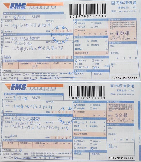 ![]() 董敬雅给最高检、最高法院邮寄刑事控告书的回执 |