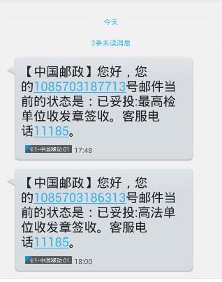 ![]() 董敬雅二零一五年五月二十九日收到中国邮政短信:已妥投,最高检单位收发章签收;已妥投,最高法单位收发章签收。 |