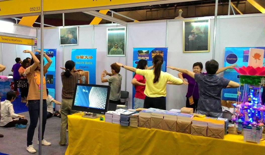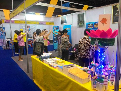 开展当天,法轮功展位即成为吸引人的亮点,展位上装饰着法轮功学员的美术作品,桌上摆放着美丽的莲花和彩灯、泰文版《转法轮》、真相资料、泰文教功光碟、真相光盘等,落地画布上画有法轮功学员在中国无辜受迫害的情景、以及法轮功弘传世界的盛况。音响播放着法轮功的功法介绍、教功录像、法轮功真相片。